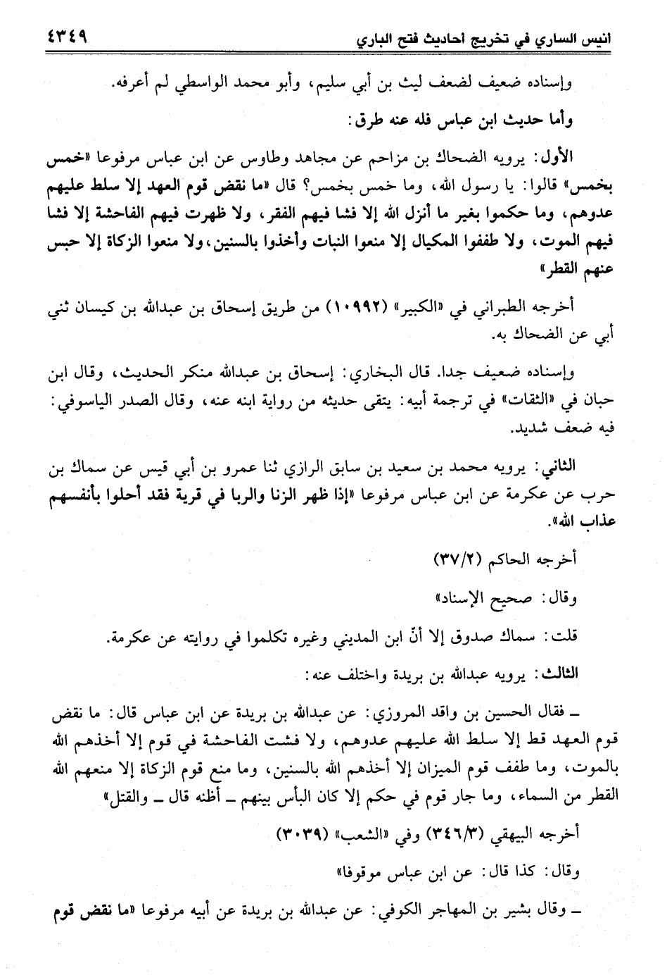 الأول: يرويه الضحاك بن مزاحم عن مجاهد وطاوس عن ابن عباس مرفوعاً "خمس بخمس" قالوا: يا رسول الله، وما خمس بخمس؟ قال "ما نقض قوم العهد إلا سلط عليهم عدوهم، وما حكموا بغير ما أنزل الله إلا فشا فيهم الفقر، ولا ظهرت فيهم الفاحشة إلا فشا فيهم الموت، ولا طففوا المكيال إلا منعوا النبات وأخذوا بالسنين، ولا منعوا الزكاة إلا حبس عنهم القطر"