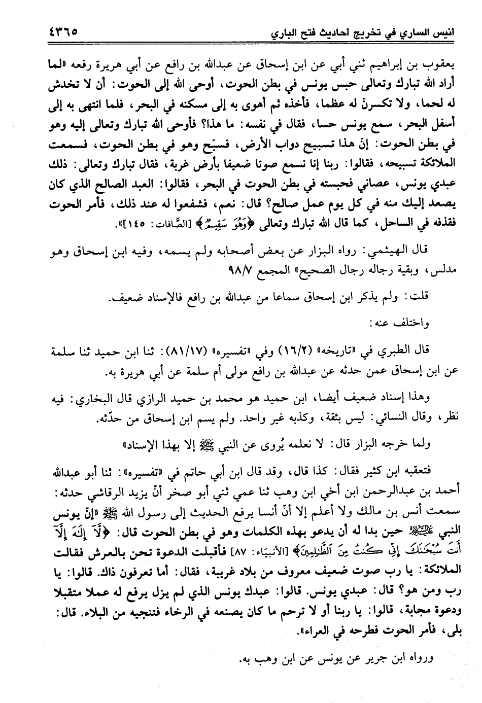 فتعقبه ابن كثير فقال: كذا قال، وقد قال ابن أبي حاتم في "تفسيره": ثنا أبو عبد الله أحمد بن عبد الرحمن ابن أخي ابن وهب ثنا عمي ثني أبو صخر أنّ يزيد الرقاشي حدثه: سمعت أنس بن مالك ولا أعلم إلا أنّ أنسا يرفع الحديث إلى رسول الله - صلى الله عليه وسلم - "إنّ يونس النبي - عليه وسلم - حين بدا له أن يدعو بهذه الكلمات وهو في بطن الحوت قال: {لَا إِلَهَ إِلَّا أَنْتَ سُبْحَانَكَ إِنِّي كُنْتُ مِنَ الظَّالِمِينَ} [الأنبياء: 87] فأقبلت الدعوة تحن بالعرش فقالت الملائكة: يا رب صوت ضعيف معروف من بلاد غريبة، فقال: أما تعرفون ذاك. قالوا: يا رب ومن هو؟ قال: عبدي يونس. قالوا: عبدك يونس الذي لم يزل يرفع له عملا متقبلا ودعوة مجابة، قالوا: يا ربنا أو لا ترحم ما كان يصنعه في الرخاء فتنجيه من البلاء. قال: بلى، فأمر الحوت فطرحه في العراء".