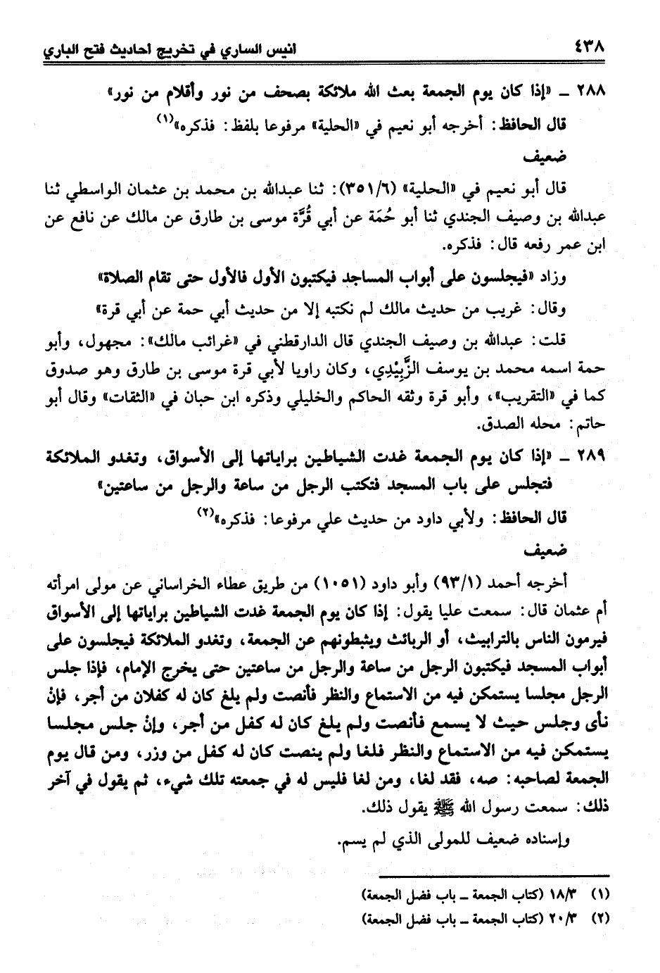 289 - "إذا كان يوم الجمعة فدت الشياطين براياتها إلى الأسواق، وتغدو الملائكة فتجلس على باب المسجد فتكتب الرجل من ساعة والرجل من ساعتين"