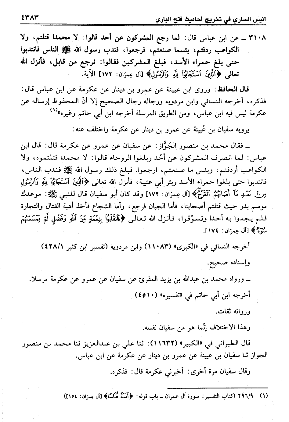 3108 - عن ابن عباس قال: لما رجع المشركون عن أحد قالوا: لا محمدا قتلتم، ولا الكواعب ردفتم، بئسما صنعتم، فرجعوا، فندب رسول الله صلى الله عليه وسلم الناس فانتدبوا حتى بلغ حمراء الأسد، فبلغ المشركين فقالوا: نرجع من قابل، فأنزل الله تعالى {الَّذِينَ اسْتَجَابُوا لِلَّهِ وَالرَّسُولِ} [آل عمران: 172] الآية.