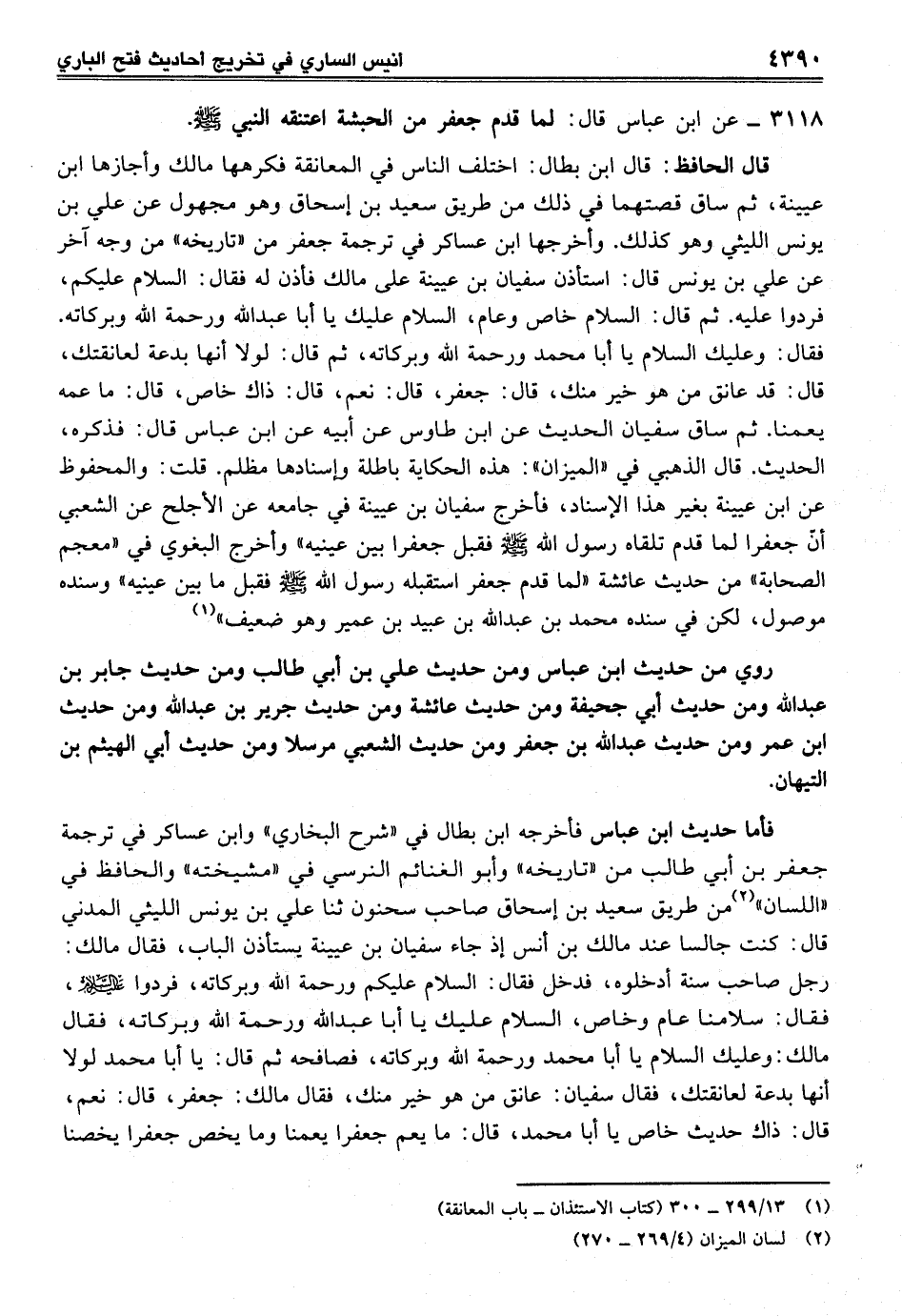فأما حديث ابن عباس فأخرجه ابن بطال في "شرح البخاري" وابن عساكر في ترجمة جعفر بن أبي طالب من "تاريخه" وأبو الغنائم النرسي في "مشيخته" والحافظ في "اللسان" (¬2) من طريق سعيد بن إسحاق صاحب سحنون ثنا علي بن يونس الليثي المدني قال: كنت جالسا عند مالك بن أنس إذ جاء سفيان بن عيينة يستأذن الباب، فقال مالك: رجل صاحب سنة أدخلوه، فدخل فقال: السلام عليكم ورحمة الله وبركاته، فردوا عليه السلام، فقال: سلامنا عام وخاص، السلام عليك يا أبا عبد الله ورحمة الله وبركاته، فقال مالك: وعليك السلام يا أبا محمد ورحمة الله وبركاته، فصافحه ثم قال: يا أبا محمد لولا أنها بدعة لعانقتك، فقال سفيان: عانق من هو خير منك، فقال مالك: جعفر، قال: نعم، قال: ذاك حديث خاص يا أبا محمد، قال: ما يعم جعفرا يعمنا وما يخص جعفرا يخصنا