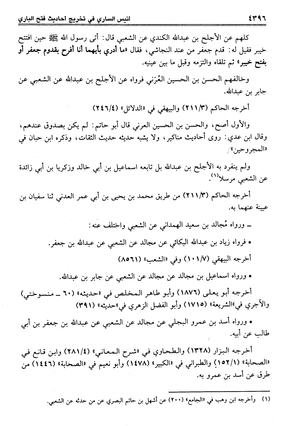 كلهم عن الأجلح بن عبد الله الكندي عن الشعبي قال: أتى رسول الله صلى الله عليه وسلم حين افتتح خيبر فقيل له: قدم جعفر من عند النجاشي، فقال "ما أدري بأيهما أنما أفرح بقدوم جعفر أو بفتح خيبر" ثم تلقاه والتزمه وقبل ما بين عينيه.