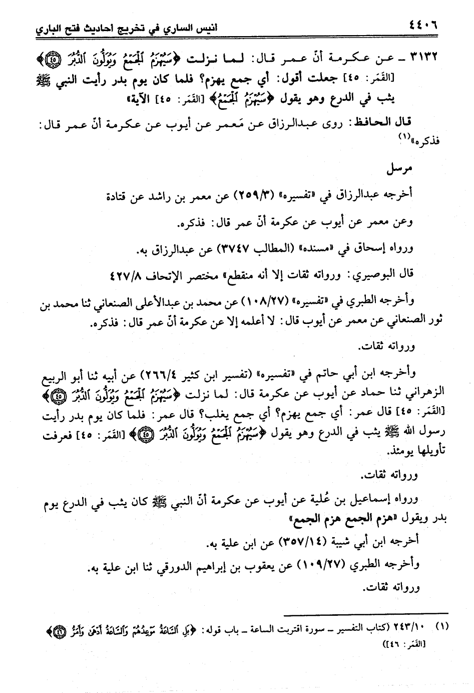 3132 - عن عكرمة أنّ عمر قال: لما نزلت {سَيُهْزَمُ الْجَمْعُ وَيُوَلُّونَ الدُّبُرَ (45)} [القمر: 45] جعلت أقول: أي جمع يهزم؟ فلما كان يوم بدر رأيت النبي - صلى الله عليه وسلم - يثب في الدرع وهو يقول {سَيُهْزَمُ الْجَمْعُ} [القمر: 45] الآية"