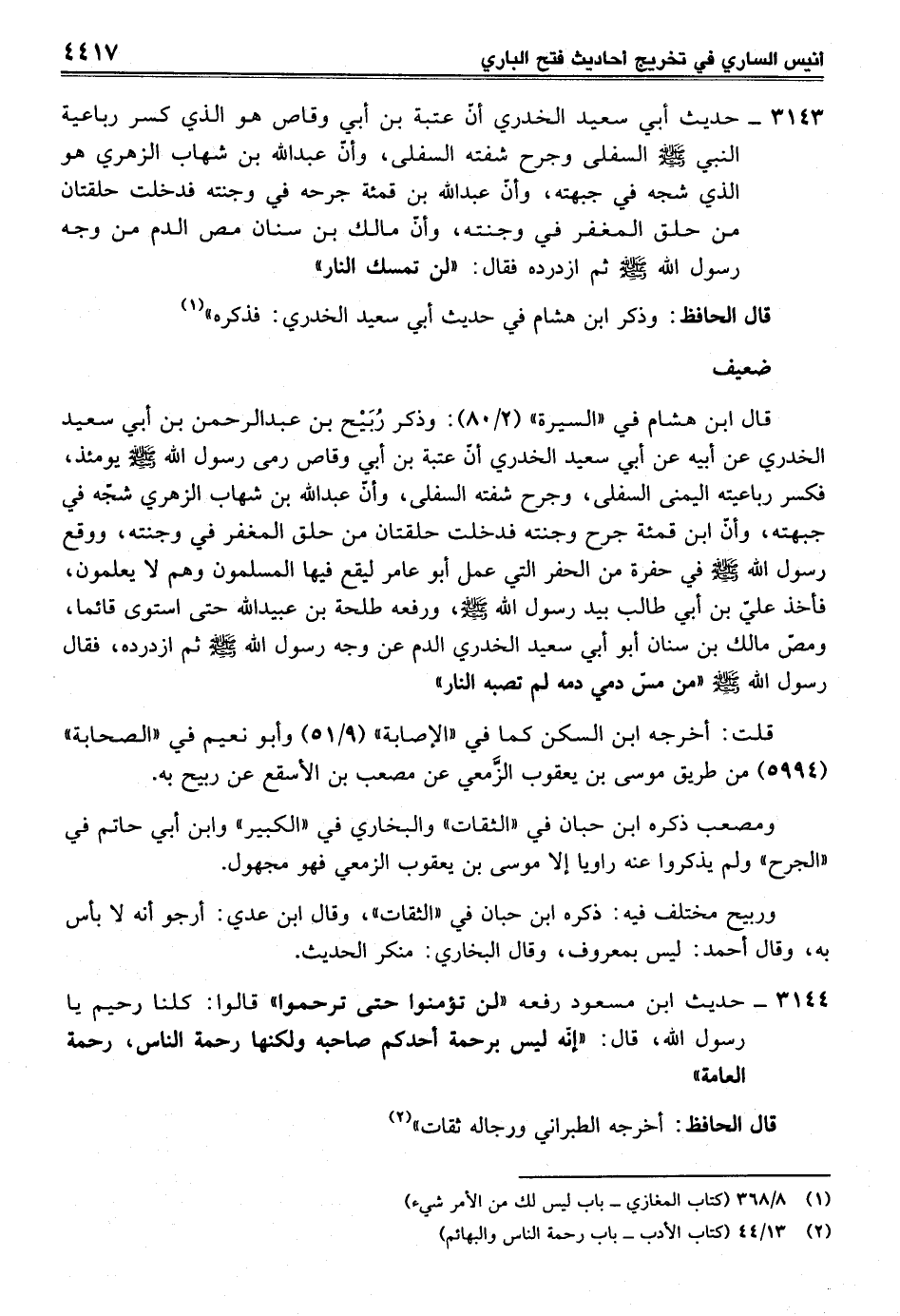 3143 - حديث أبي سعيد الخدري أنّ عتبة بن أبي وقاص هو الذي كسر رباعية النبي - صلى الله عليه وسلم - السفلى وجرح شفته السفلى، وأنّ عبد الله بن شهاب الزهري هو الذي شجه في جبهته، وأنّ عبد الله بن قمئة جرحه في وجنته فدخلت حلقتان من حلق المغفر في وجنته، وأنّ مالك بن سنان مص الدم من وجه رسول الله صلى الله عليه وسلم ثم ازدرده فقال: "لن تمسك النار"