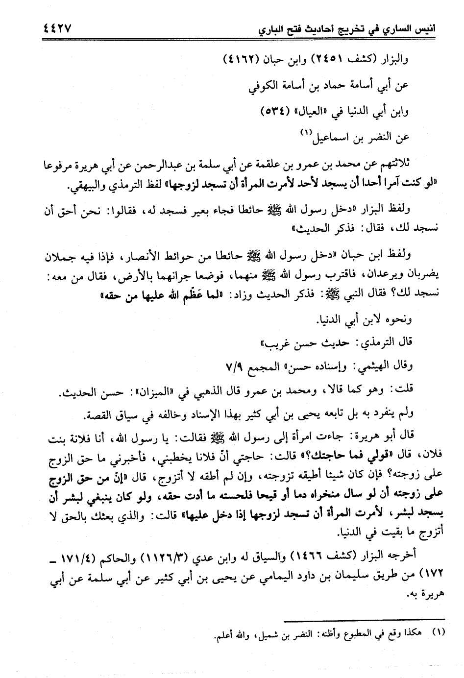 ثلاثتهم عن محمد بن عمرو بن علقمة عن أبي سلمة بن عبد الرحمن عن أبي هريرة مرفوعاً "لو كنت آمرا أحدا أن يسجد لأحد لأمرت المرأة أن تسجد لزوجها" لفظ الترمذي والبيهقي.
