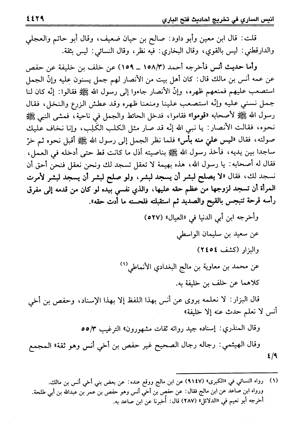 وأما حديث أنس فأخرجه أحمد (3/ 158 - 159) عن خلف بن خليفة عن حفص عن عمه أنس بن مالك قال: كان أهل بيت من الأنصار لهم جمل يسنون عليه وإنّ الجمل استصعب عليهم فمنعهم ظهره، وإنّ الأنصار جاءوا إلى رسول الله - صلى الله عليه وسلم - فقالوا: إنّه كان لنا جمل نسني عليه وإنّه استصعب علينا ومنعنا ظهره وقد عطش الزرع والنخل، فقال رسول الله - صلى الله عليه وسلم - لأصحابه "قوموا" فقاموا، فدخل الحائط والجمل في ناحية، فمشى النبي - صلى الله عليه وسلم - نحوه، فقالت الأنصار: يا نبي الله إنّه قد صار مثل الكلب الكَلِب، وإنا نخاف عليك صولته، فقال "ليس عليّ منه بأس" فلما نظر الجمل إلى رسول الله - صلى الله عليه وسلم - أقبل نحوه ثم خرّ ساجدا بين يديه، فأخذ رسول الله صلى الله عليه وسلم بناصيته أذل ما كانت قط حتى أدخله في العمل، فقال له أصحابه: يا رسول الله، هذه بهيمة لا تعقل تسجد لك ونحن نعقل فنحن أحق أن نسجد لك، فقال "لا يصلح لبشر أن يسجد لبشر، ولو صلح لبشر أن يسجد لبشر لأمرت المرأة أن تسجد لزوجها من عظم حقه عليها، والذي نفسي بيده لو كان من قدمه إلى مفرق رأسه قرحة تنبجس بالقيح والصديد ثم استقبلته فلحسته ما أدت حقه".