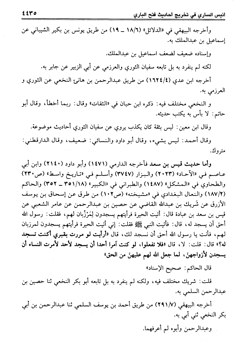 وأما حديث قيس بن سعد فأخرجه الدارمي (1471) وأبو داود (2140) وابن أبي عاصم في "الآحاد" (2023) والبزار (3747) وأسلم في "تاريخ واسط" (ص 230) والطحاوي في "المشكل" (1487) والطبراني في "الكبير" (18/ 351 - 352) والحاكم (2/ 187) والنعال البغدادي في "مشيخته" (ص 102) من طرق عن إسحاق بن يوسف الأزرق عن شَريك بن عبد الله القاضي عن حصين بن عبد الرحمن عن عامر الشعبي عن قيس بن سعد بن عبادة قال: أتيت الحيرة فرأيتهم يسجدون لِمَرْزُبان لهم، فقلت: رسول الله أحق أن يسجد له، قال: فأتيت النبي صلى الله عليه وسلم فقلت: إني أتيت الحيرة فرأيتهم يسجدون لمرزبان لهم، فأنت يا رسول الله أحق أن نسجد لك، قال "أرأيت لو مررت بقبري أكنت تسجد له؟ " قال: قلت: لا، قال "فلا تفعلوا، لو كنت آمرا أحدا أن يسجد لأحد لأمرت النساء أن يسجدن لأزواجهن، لما جعل الله لهم عليهنّ من الحق"