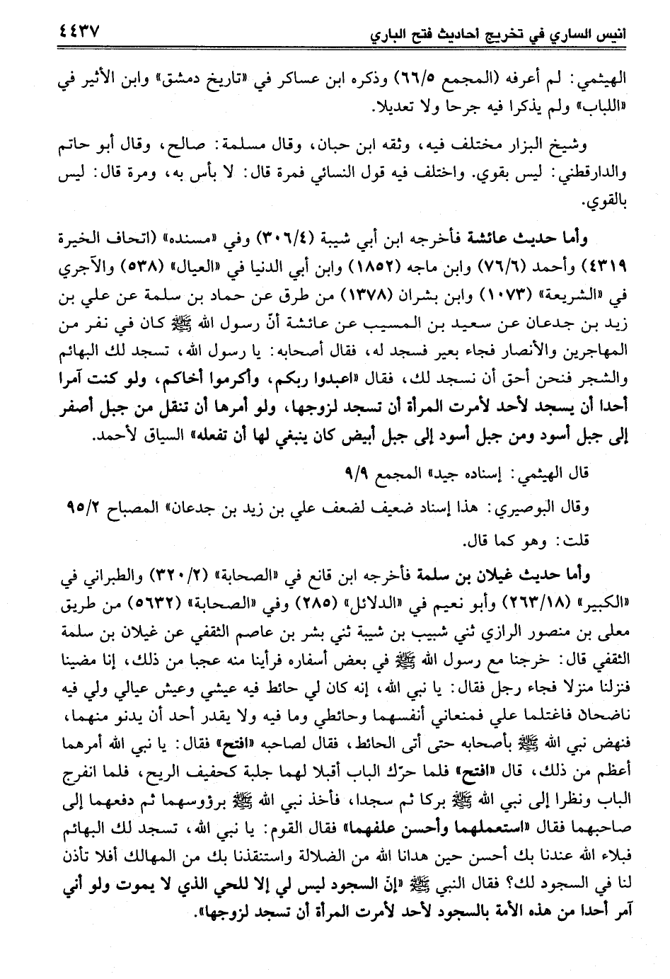 وأما حديث غيلان بن سلمة فأخرجه ابن قانع في "الصحابة" (2/ 320) والطبراني في "الكبير" (18/ 263) وأبو نعيم في "الدلائل" (285) وفي "الصحابة" (5632) من طريق معلي بن منصور الرازي ثني شبيب بن شيبة ثني بشر بن عاصم الثقفي عن غيلان بن سلمة الثقفي قال: خرجنا مع رسول الله - صلى الله عليه وسلم - في بعض أسفاره فرأينا منه عجبا من ذلك، إنا مضينا فنزلنا منزلا فجاء رجل فقال: يا نبي الله، إنه كان لي حائط فيه عيشي وعيش عيالي ولي فيه ناضحان فاغتلما علي فمنعاني أنفسهما وحائطي وما فيه ولا يقدر أحد أن يدنو منهما، فنهض نبي الله - صلى الله عليه وسلم - بأصحابه حتى أتى الحائط، فقال لصاحبه "افتح" فقال: يا نبي الله أمرهما أعظم من ذلك، قال "افتح" فلما حرّك الباب أقبلا لهما جلبة كحفيف الريح، فلما انفرج الباب ونظرا إلى نبي الله - صلى الله عليه وسلم - بركا ثم سجدا، فأخذ نبي الله - صلى الله عليه وسلم - برؤوسهما ثم دفعهما إلى صاحبهما فقال "استعملهما وأحسن علفهما" فقال القوم: يا نبي الله، تسجد لك البهائم فبلاء الله عندنا بك أحسن حين هدانا الله من الضلالة واستنقذنا بك من المهالك أفلا تأذن لنا في السجود لك؟ فقال النبي صلى الله عليه وسلم "إن السجود ليس لي إلا للحي الذي لا يموت ولو أني آمر أحدا من هذه الأمة بالسجود لأحد لأمرت المرأة أن تسجد لزوجها".