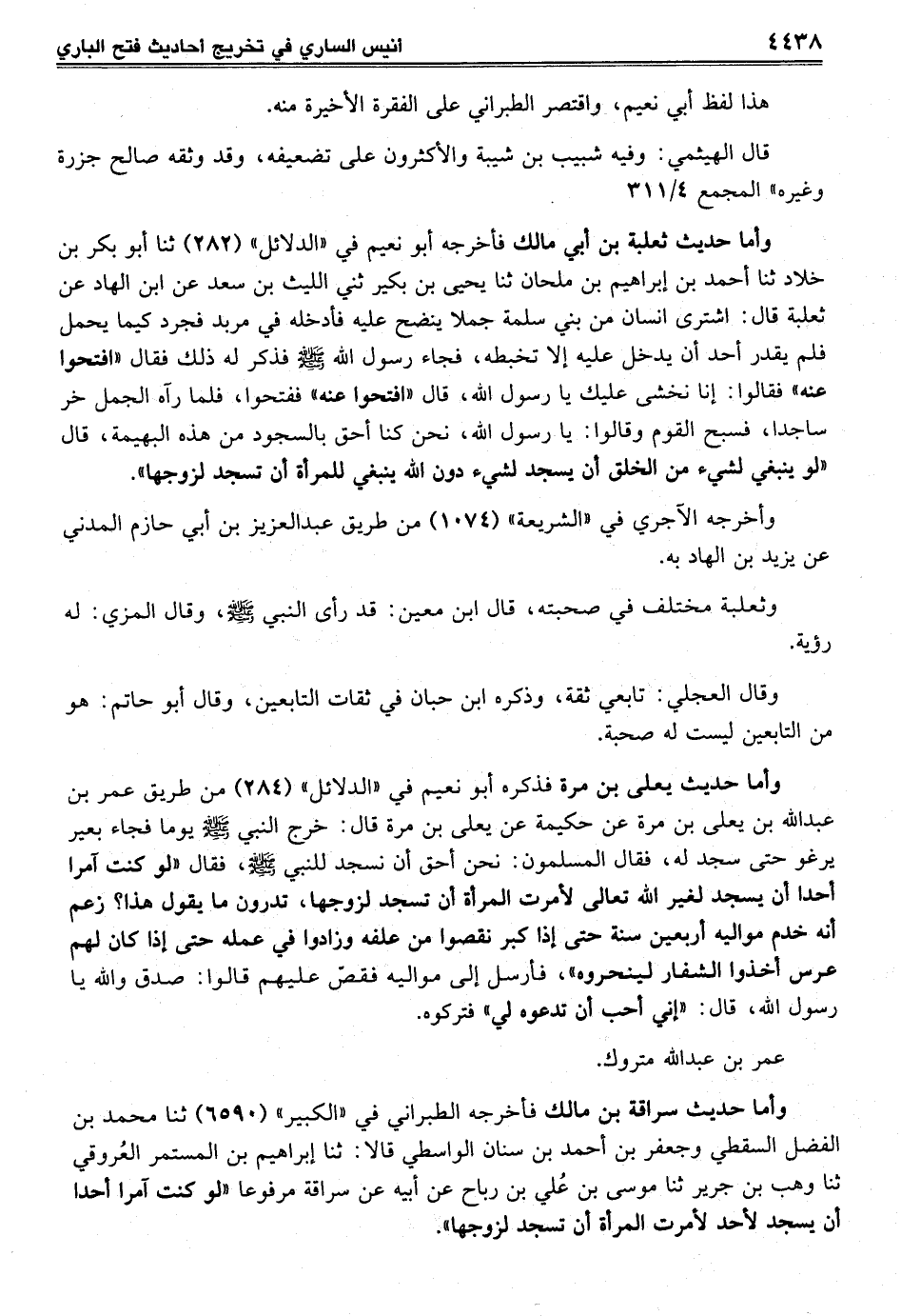 وأما حديث ثعلبة بن أبي مالك فأخرجه أبو نعيم في "الدلائل" (282) ثنا أبو بكر بن خلاد ثنا أحمد بن إبراهيم بن ملحان ثنا يحيى بن بكير ثني الليث بن سعد عن ابن الهاد عن ثعلبة قال: اشترى إنسان من بني سلمة جملا ينضح عليه فأدخله في مربد فجرد كيما يحمل فلم يقدر أحد أن يدخل عليه إلا تخبطه، فجاء رسول الله -صلى الله عليه وسلم - فذكر له ذلك فقال "افتحوا عنه" فقالوا: إنا نخشى عليك يا رسول الله، قال "افتحوا عنه" ففتحوا، فلما رآه الجمل خر ساجدا، فسبح القوم وقالوا: يا رسول الله، نحن كنا أحق بالسجود من هذه البهيمة، قال "لو ينبغي لشيء من الخلق أن يسجد لشيء دون الله ينبغي للمرأة أن تسجد لزوجها".