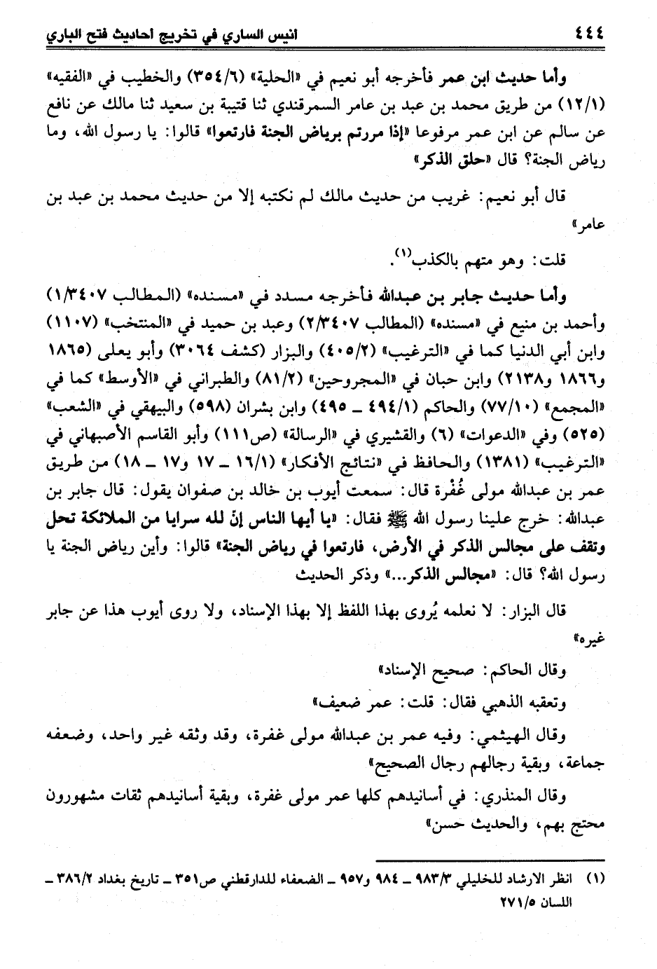 وأما حديث ابن عمر فأخرجه أبو نعيم في "الحلية" (6/ 354) والخطيب في "الفقيه" (1/ 12) من طريق محمَّد بن عبد بن عامر السمرقندي ثنا قتيبة بن سعيد ثنا مالك عن نافع عن سالم عن ابن عمر مرفوعا "إذا مررتم برياض الجنة فارتعوا" قالوا: يا رسول الله، وما رياض الجنة؟ قال "حلق الذكر"