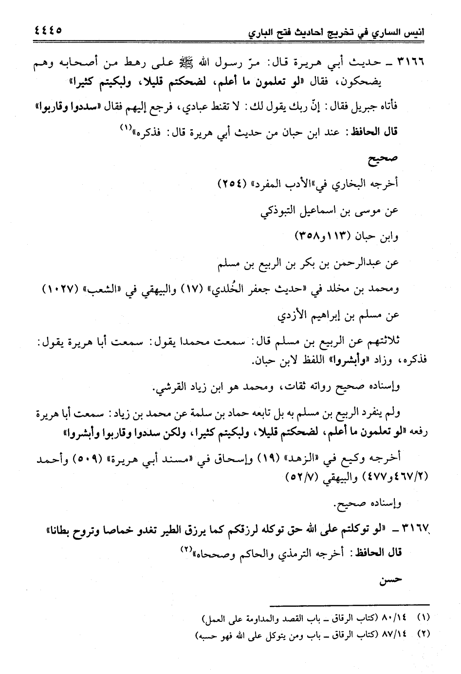 ولم ينفرد الربيع بن مسلم به بل تابعه حماد بن سلمة عن محمد بن زياد: سمعت أبا هريرة رفعه "لو تعلمون ما أعلم، لضحكتم قليلا، ولبكيتم كثيرا، ولكن سددوا وقاربوا وأبشروا"