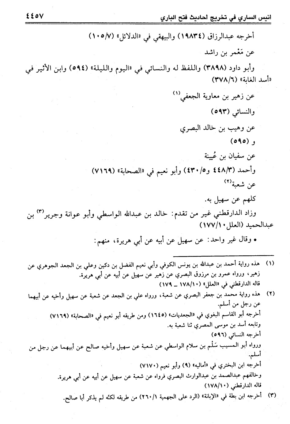 (¬1) هذه رواية أحمد بن عبد الله بن يونس الكوفي وأبي نعيم الفضل بن دكين وعلي بن الجعد الجوهري عن زهير، ورواه عمرو بن مرزوق البصري عن زهير عن سهيل عن أبيه عن أبي هريرة.