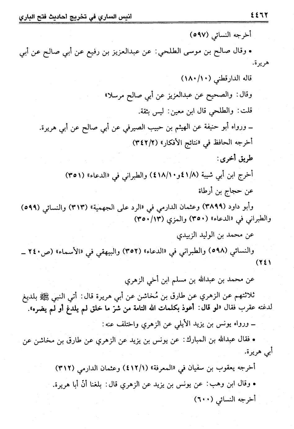 ثلاثتهم عن الزهري عن طارق بن مُخاشن عن أبي هريرة قال: أتي النبي - صلى الله عليه وسلم - بلديغ لدغته عقرب فقال "لو قال: أعوذ بكلمات الله التامة من شرّ ما خلق لم يلدغ أو لم يضره".