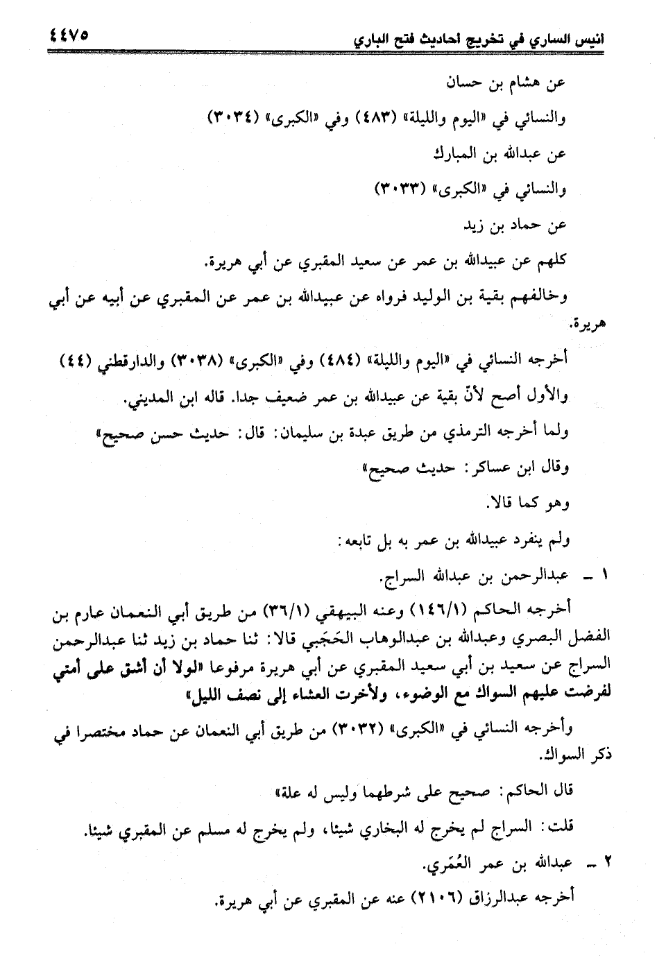 أخرجه الحاكم (1/ 146) وعنه البيهقي (1/ 36) من طريق أبي النعمان عارم بن الفضل البصري وعبد الله بن عبد الوهاب الحَجَبي قالا: ثنا حماد بن زيد ثنا عبد الرحمن السراج عن سعيد بن أبي سعيد المقبري عن أبي هريرة مرفوعا "لولا أن أشق على أمتي لفرضت عليهم السواك مع الوضوء، ولأخرت العشاء إلى نصف الليل"
