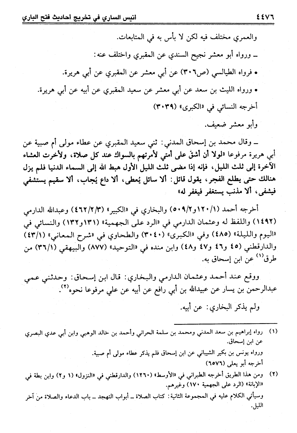 - وقال محمد بن إسحاق المدني: ثني سعيد المقبري عن عطاء مولى أم صبية عن أبي هريرة مرفوعا "لولا أن أشق على أمتي لأمرتهم بالسواك عند كل صلاة، ولأخرت العشاء الآخرة إلى ثلث الليل، فإنه إذا مضى ثلث الليل الأول هبط الله إلى السماء الدنيا فلم يزل هنالك حتى يطلع الفجر، يقول قائل: ألا سائل يُعطى، ألا داع يُجاب، ألا سقيم يستشفي فيشفى، ألا مذنب يستغفر فيغفر له"