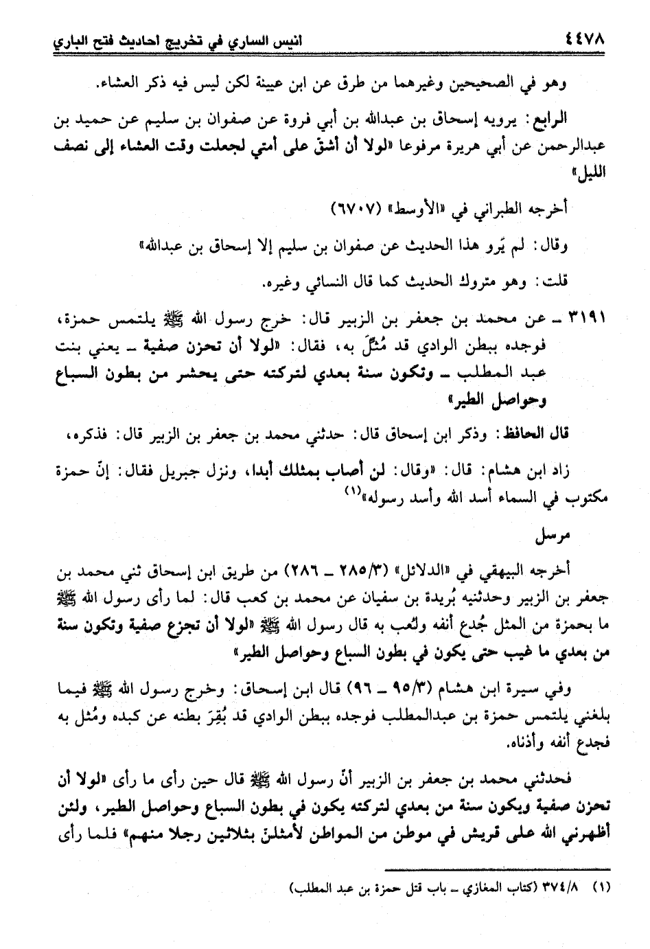 3191 - عن محمد بن جعفر بن الزبير قال: خرج رسول الله -صلى الله عليه وسلم- يلتمس حمزة، فوجده ببطن الوادي قد مُثِّلَ به، فقال: "لولا أن تحزن صفية -يعني بنت عبد المطلب- وتكون سنة بعدي لتركته حتى يحشر من بطون السباع وحواصل الطير"