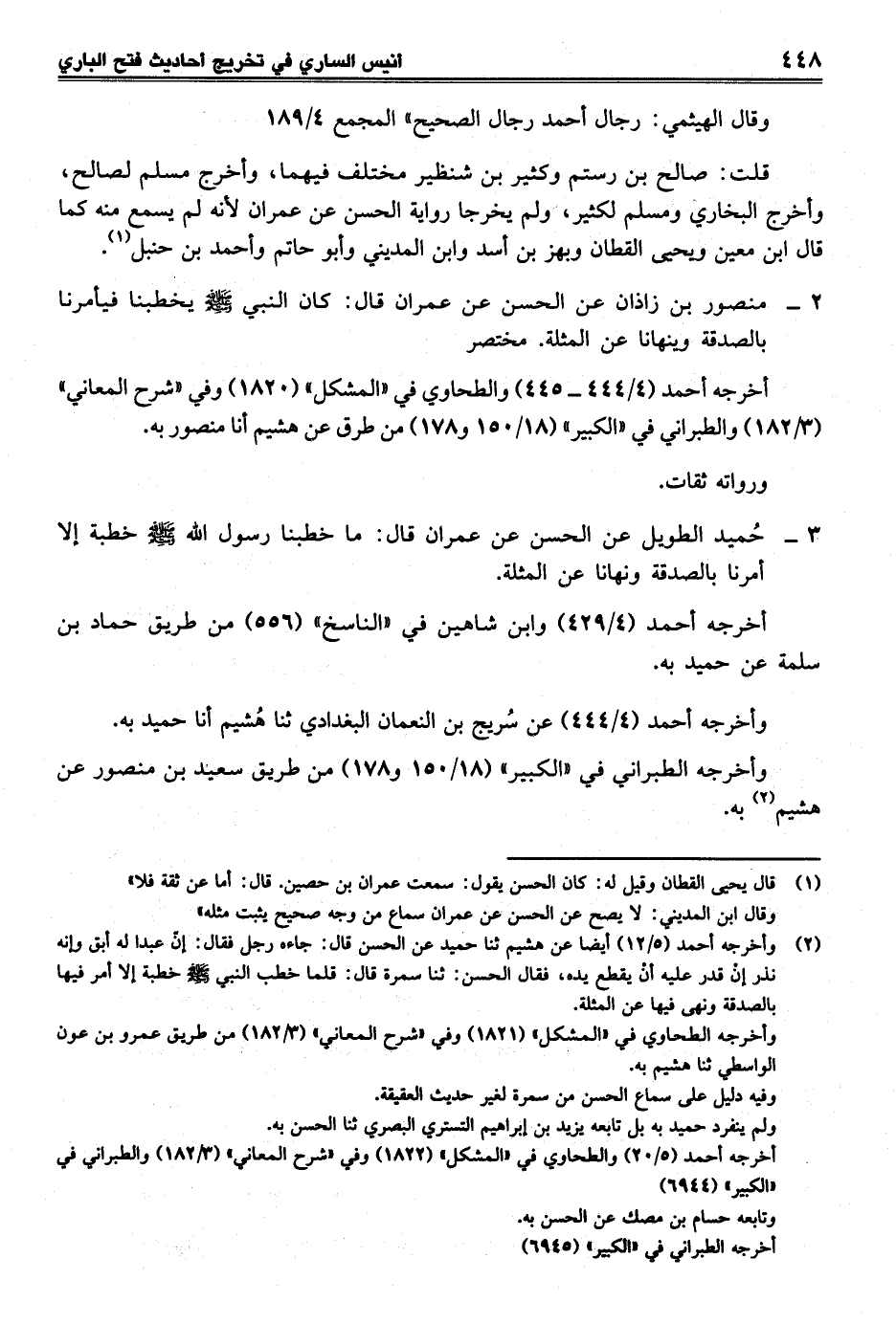 قلت: صالح بن رستم وكثير بن شنظير مختلف فيهما، وأخرج مسلم لصالح، وأخرج البخاري ومسلم لكثير، ولم يخرجا رواية الحسن عن عمران لأنه لم يسمع منه كما قال ابن معين ويحيى القطان وبهز بن أسد وابن المديني وأبو حاتم وأحمد بن حنبل (¬1).