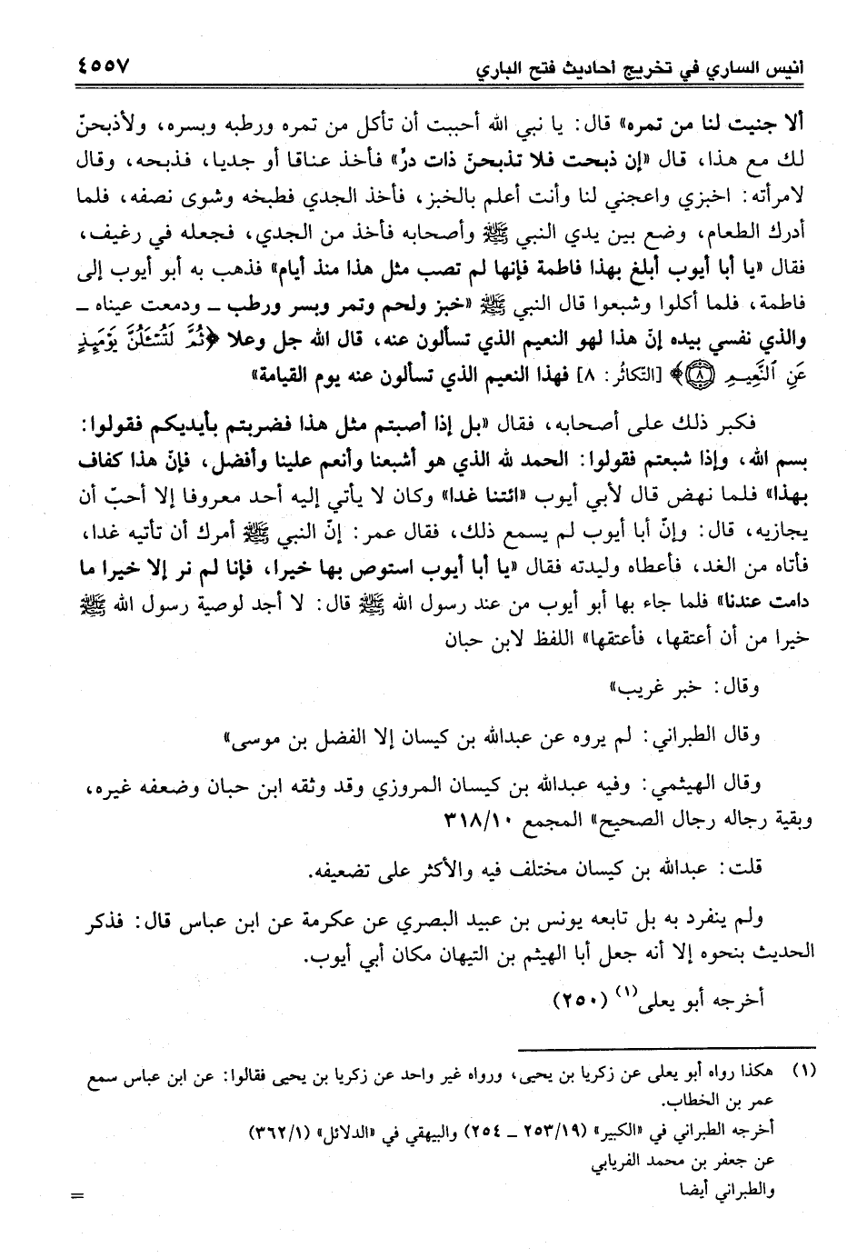 ألا جنيت لنا من تمره" قال: يا نبي الله أحببت أن تأكل من تمره ورطبه وبسره، ولأذبحنّ لك مع هذا، قال "إن ذبحت فلا تذبحنّ ذات درِّ" فأخذ عناقا أو جديا، فذبحه، وقال لامرأته: اخبزي واعجني لنا وأنت أعلم بالخبز، فأخذ الجدي فطبخه وشوى نصفه، فلما أدرك الطعام، وضع بين يدي النبي - صلى الله عليه وسلم - وأصحابه فأخذ من الجدي، فجعله في رغيف، فقال "يا أبا أيوب أبلغ بهذا فاطمة فإنها لم تصب مثل هذا منذ أيام" فذهب به أبو أيوب إلى فاطمة، فلما أكلوا وشبعوا قال النبي - صلى الله عليه وسلم - "خبز ولحم وتمر وبسر ورطب- ودمعت عيناه- والذي نفسي بيده إنّ هذا لهو النعيم الذي تسألون عنه، قال الله جل وعلا {ثُمَّ لَتُسْأَلُنَّ يَوْمَئِذٍ عَنِ النَّعِيمِ (8)} [التكاثر: 8] فهذا النعيم الذي تسألون عنه يوم القيامة"