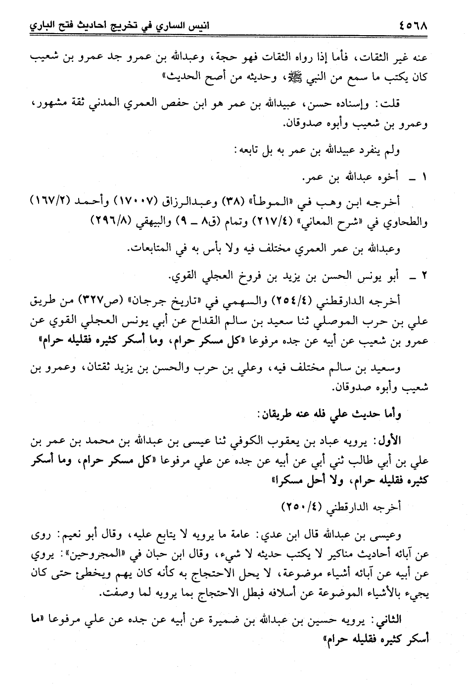 الأول: يرويه عباد بن يعقوب الكوفي ثنا عيسى بن عبد الله بن محمد بن عمر بن علي بن أبي طالب ثني أبي عن أبيه عن جده عن علي مرفوعا "كل مسكر حرام، وما أسكر كثيره فقليله حرام، ولا أحل مسكرا"