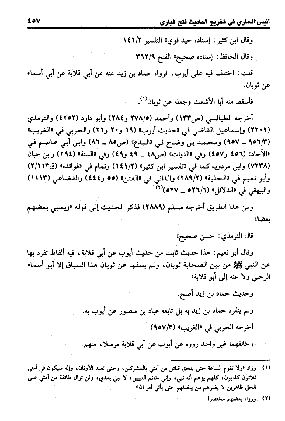 وقال أبو نعيم: هذا حديث ثابت من حديث أيوب عن أبي قلابة، فيه ألفاظ تفرد بها عن النبي - صلى الله عليه وسلم - من بين الصحابة ثوبان، ولم يسقها عن ثوبان هذا السياق إلا أبو أسماء الرحبي ولا عنه إلى أبو قلابة"