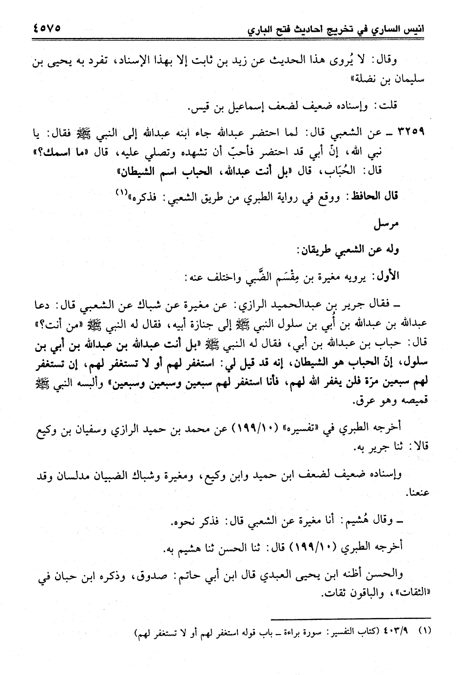 3259 - عن الشعبي قال: لما احتضر عبد الله جاء ابنه عبد الله إلى النبي - صلى الله عليه وسلم - فقال: يا نبي الله، إنّ أبى قد احتضر فأحبّ أن تشهده وتصلي عليه، قال "ما اسمك؟ " قال: الحُبَاب، قال "بل أنت عبد الله، الحباب اسم الشيطان"