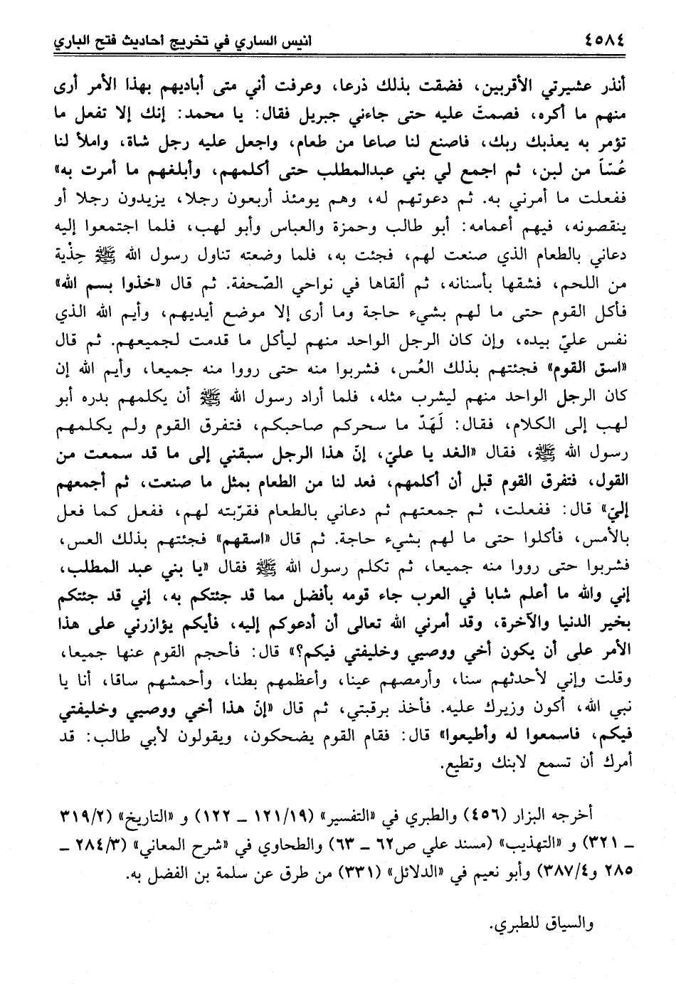 أنذر عشيرتي الأقربين، فضقت بذلك ذرعا، وعرفت أني متى أباديهم بهذا الأمر أرى منهم ما أكره، فصمتّ عليه حتى جاءني جبريل فقال: يا محمد: إنك إلا تفعل ما تؤمر به يعذبك ربك، فاصنع لنا صاعا من طعام، واجعل عليه رجل شاة، واملأ لنا عُسًّا من لبن، ثم اجمع لي بني عبد المطلب حتى أكلمهم، وأبلغهم ما أمرت به" ففعلت ما أمرني به. ثم دعوتهم له، وهم يومئذ أربعون رجلا، يزيدون رجلا أو ينقصونه، فيهم أعمامه: أبو طالب وحمزة والعباس وأبو لهب، فلما اجتمعوا إليه دعاني بالطعام الذي صنعت لهم، فجئت به، فلما وضعته تناول رسول الله - صلى الله عليه وسلم - حِذْية من اللحم، فشقها بأسنانه، ثم ألقاها في نواحي الصّحفة. ثم قال "خذوا بسم الله" فأكل القوم حتى ما لهم بشيء حاجة وما أرى إلا موضع أيديهم، وأيم الله الذي نفس عليّ بيده، وإن كان الرجل الواحد منهم ليأكل ما قدمت لجميعهم. ثم قال "اسق القوم" فجئتهم بذلك العُس، فشربوا منه حتى رووا منه جميعا، وأيم الله إن كان الرجل الواحد منهم ليشرب مثله، فلما أراد رسول الله - صلى الله عليه وسلم - أن يكلمهم بدره أبو لهب إلى الكلام، فقال: لَهَدّ ما سحركم صاحبكم، فتفرق القوم ولم يكلمهم رسول الله - صلى الله عليه وسلم -، فقال "الغد يا عليّ، إنّ هذا الرجل سبقني إلى ما قد سمعت من القول، فتفرق القوم قبل أن أكلمهم، فعد لنا من الطعام بمثل ما صنعت، ثم أجمعهم إليّ" قال: ففعلت، ثم جمعتهم ثم دعاني بالطعام فقرّبته لهم، ففعل كما فعل بالأمس، فأكلوا حتى ما لهم بشيء حاجة. ثم قال "اسقهم" فجئتهم بذلك العس، فشربوا حتى رووا منه جميعا، ثم تكلم رسول الله - صلى الله عليه وسلم - فقال "يا بني عبد المطلب، إني والله ما أعلم شابا في العرب جاء قومه بأفضل مما قد جئتكم به، إني قد جئتكم بخير الدنيا والآخرة، وقد أمرني الله تعالى أن أدعوكم إليه، فأيكم يؤازرني على هذا الأمر على أن يكون أخي ووصيي وخليفتي فيكم؟ " قال: فأحجم القوم عنها جميعا، وقلت وإني لأحدثهم سنا، وأرمصهم عينا، وأعظمهم بطنا، وأحمشهم ساقا، أنا يا نبي الله، أكون وزيرك عليه. فأخذ برقبتي، ثم قال "إنّ هذا أخي ووصيي وخليفتي فيكم، فاسمعوا له وأطيعوا" قال: فقام القوم يضحكون، ويقولون لأبي طالب: قد أمرك أن تسمع لابنك وتطيع.