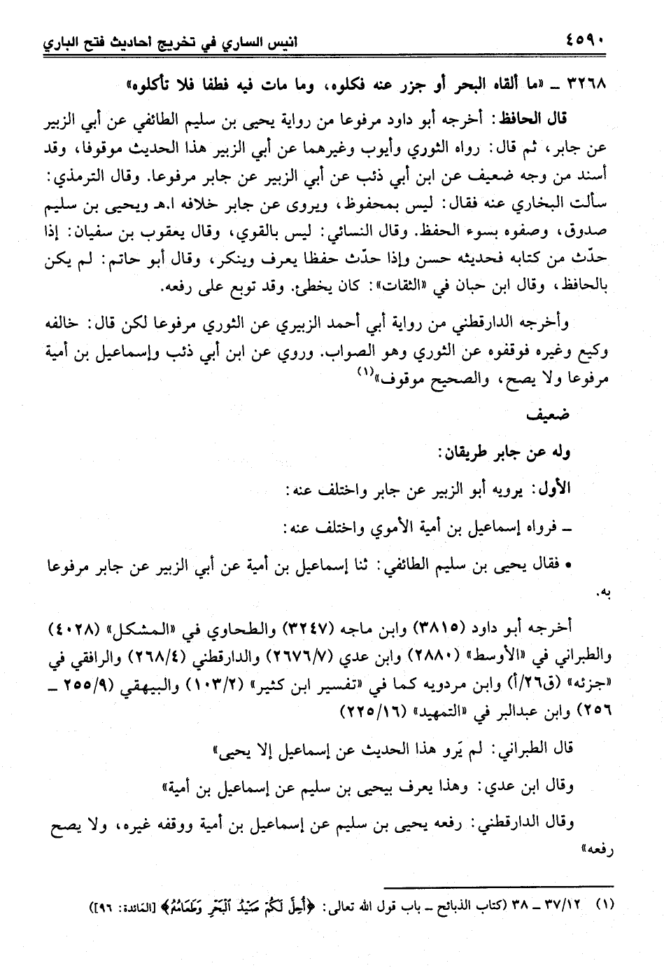 3268 - "ما ألقاه البحر أو جزر عنه فكلوه، وما مات فيه فطفا فلا تأكلوه"
