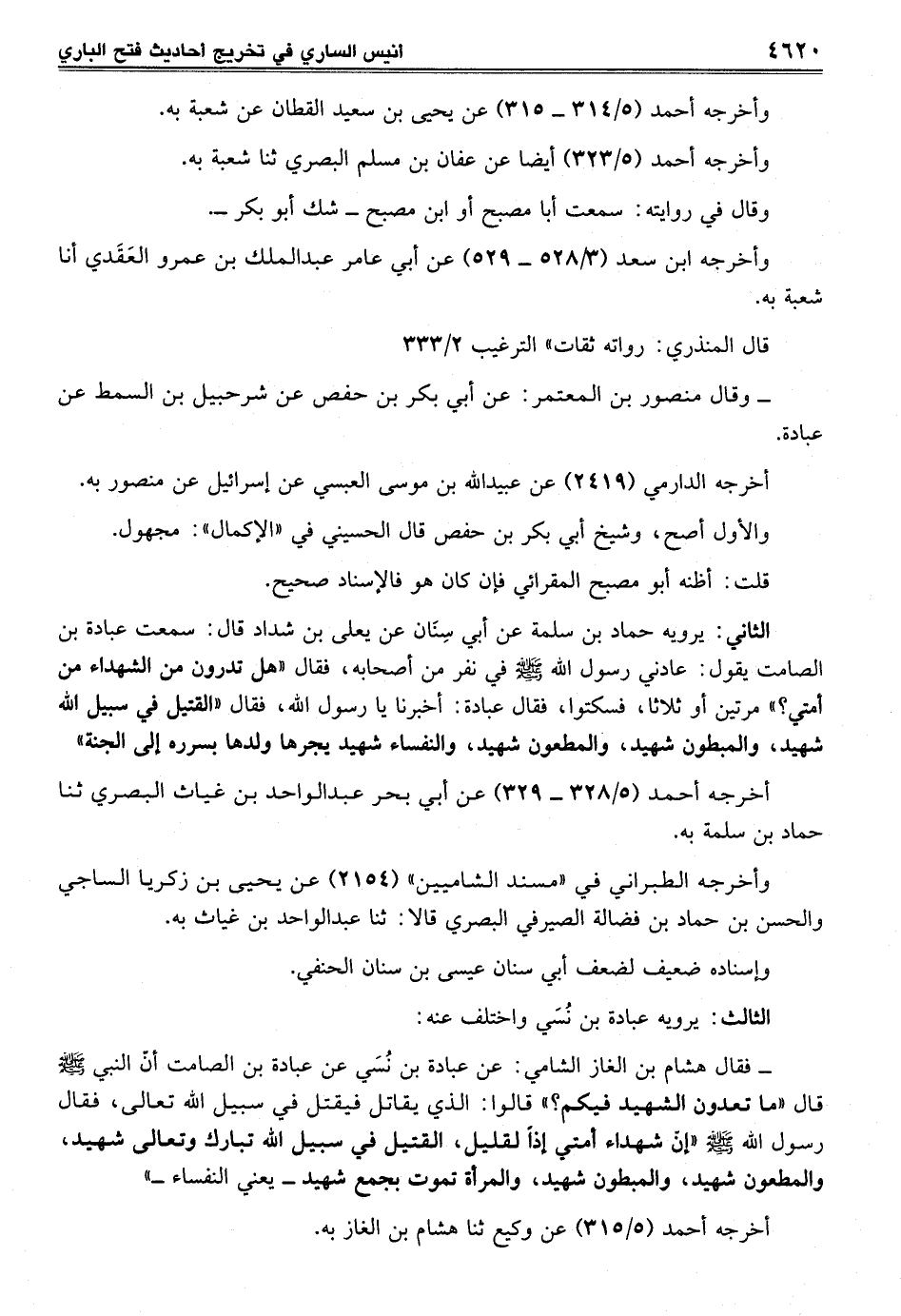 الثاني: يرويه حماد بن سلمة عن أبي سِنَان عن يعلي بن شداد قال: سمعت عبادة بن الصامت يقول: عادني رسول الله - صلى الله عليه وسلم - في نفر من أصحابه، فقال "هل تدرون من الشهداء من أمتي؟ " مرتين أو ثلاثا، فسكتوا، فقال عبادة: أخبرنا يا رسول الله، فقال "القتيل في سبيل الله شهيد، والمبطون شهيد، والمطعون شهيد، والنفساء شهيد يجرها ولدها بسرره إلى الجنة"