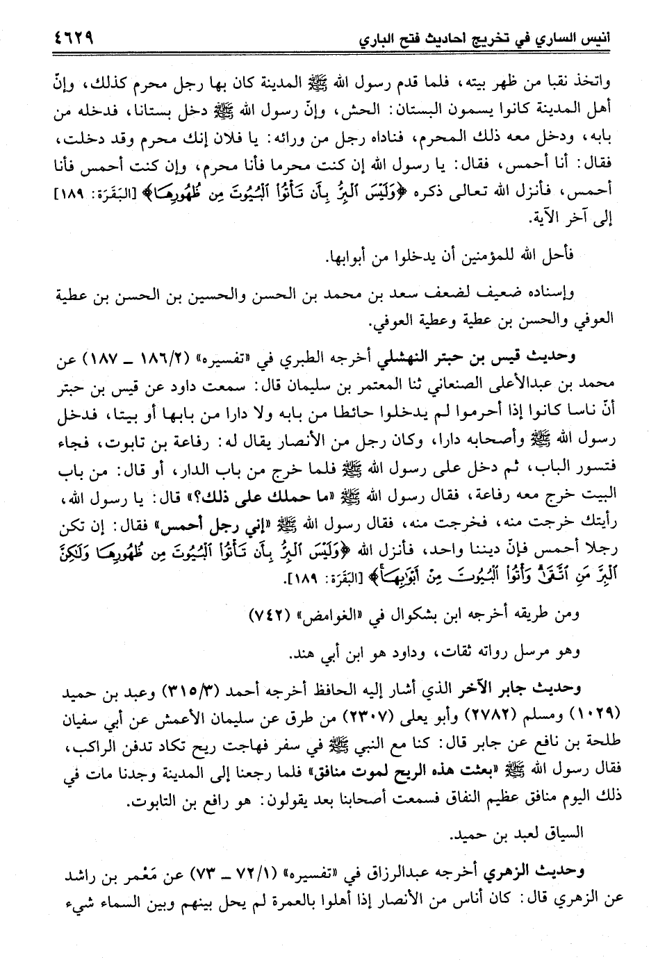وحديث قيس بن حبتر النهشلي أخرجه الطبري في "تفسيره" (2/ 186 - 187) عن محمد بن عبد الأعلى الصنعاني ثنا المعتمر بن سليمان قال: سمعت داود عن قيس بن حبتر أنّ ناسا كانوا إذا أحرموا لم يدخلوا حائطا من بابه ولا دارا من بابها أو بيتا، فدخل رسول الله - صلى الله عليه وسلم - وأصحابه دارا، وكان رجل من الأنصار يقال له: رفاعة بن تابوت، فجاء فتسور الباب، ثم دخل على رسول الله - صلى الله عليه وسلم - فلما خرج من باب الدار، أو قال: من باب البيت خرج معه رفاعة، فقال رسول الله - صلى الله عليه وسلم - "ما حملك على ذلك؟ " قال: يا رسول الله، رأيتك خرجت منه، فخرجت منه، فقال رسول الله - صلى الله عليه وسلم - "إني رجل أحمس" فقال: إن تكن رجلا أحمس فإنّ ديننا واحد، فأنزل الله {وَلَيْسَ الْبِرُّ بِأَنْ تَأْتُوا الْبُيُوتَ مِنْ ظُهُورِهَا وَلَكِنَّ الْبِرَّ مَنِ اتَّقَى وَأْتُوا الْبُيُوتَ مِنْ أَبْوَابِهَا} [البَقَرَة: 189].