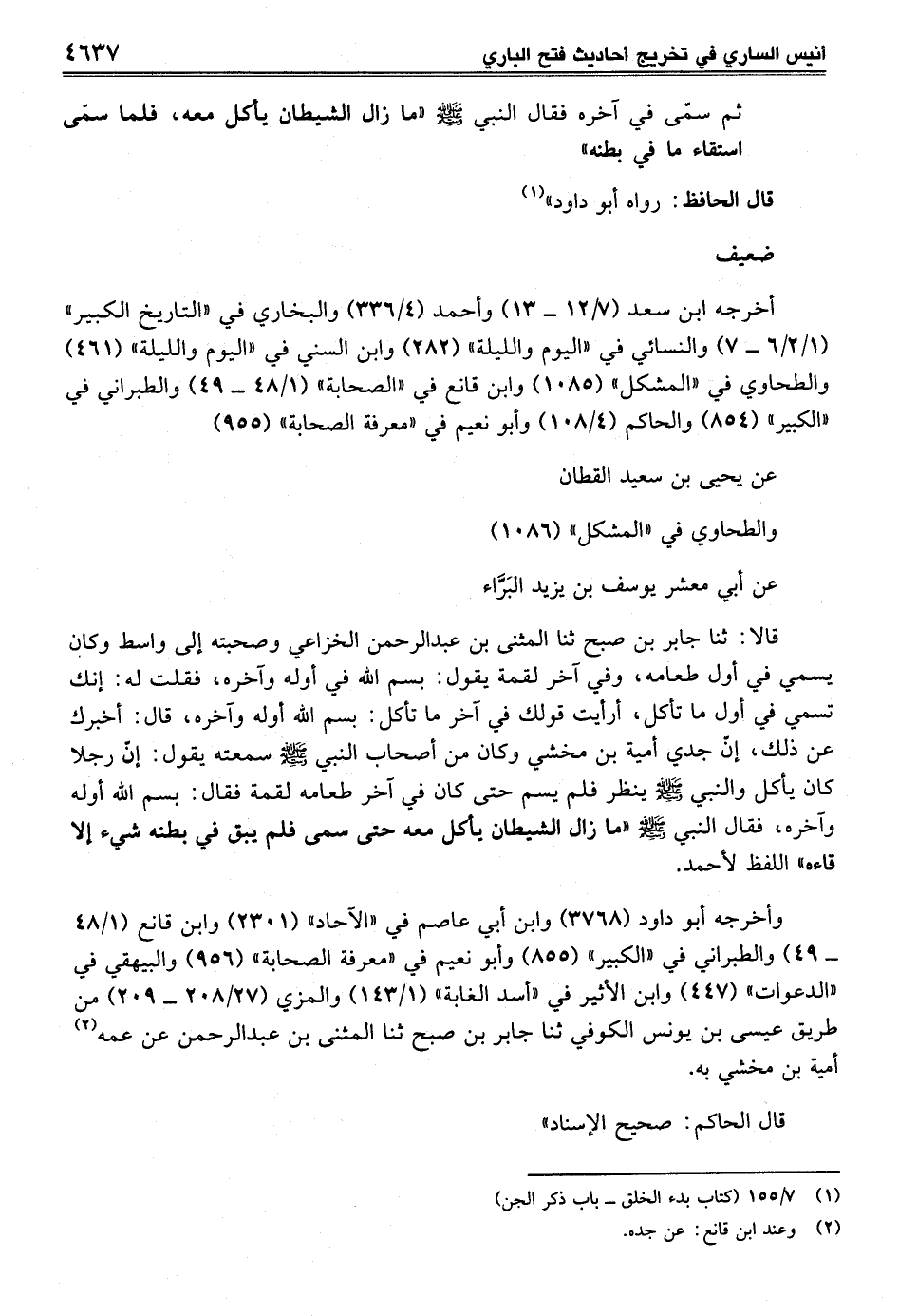 قالا: ثنا جابر بن صبح ثنا المثنى بن عبد الرحمن الخزاعي وصحبته إلى واسط وكان يسمي في أول طعامه، وفي آخر لقمة يقول: بسم الله في أوله وآخره، فقلت له: إنك تسمي في أول ما تأكل، أرأيت قولك في آخر ما تأكل: بسم الله أوله وآخره، قال: أخبرك عن ذلك، إنّ جدي أمية بن مخشي وكان من أصحاب النبي - صلى الله عليه وسلم - سمعته يقول: إنّ رجلا كان يأكل والنبي - صلى الله عليه وسلم - ينظر فلم يسم حتى كان في آخر طعامه لقمة فقال: بسم الله أوله وآخره، فقال النبي - صلى الله عليه وسلم - "ما زال الشيطان يأكل معه حتى سمى فلم يبق في بطنه شيء إلا قاءه" اللفظ لأحمد.