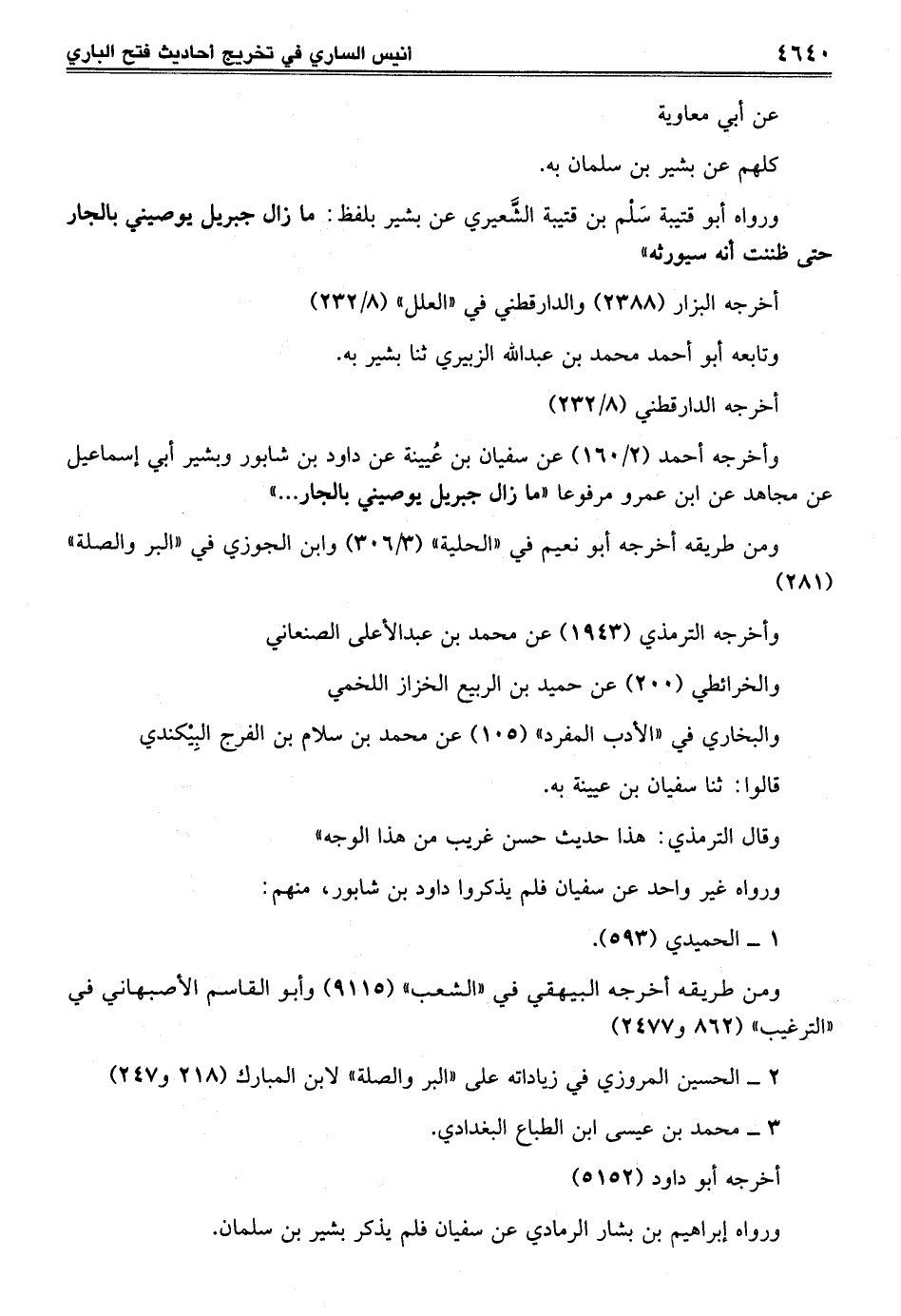 ورواه أبو قتيبة سَلْم بن قتيبة الشَّعيري عن بشير بلفظ: ما زال جبريل يوصيني بالجار حتى ظننت أنه سيورثه"