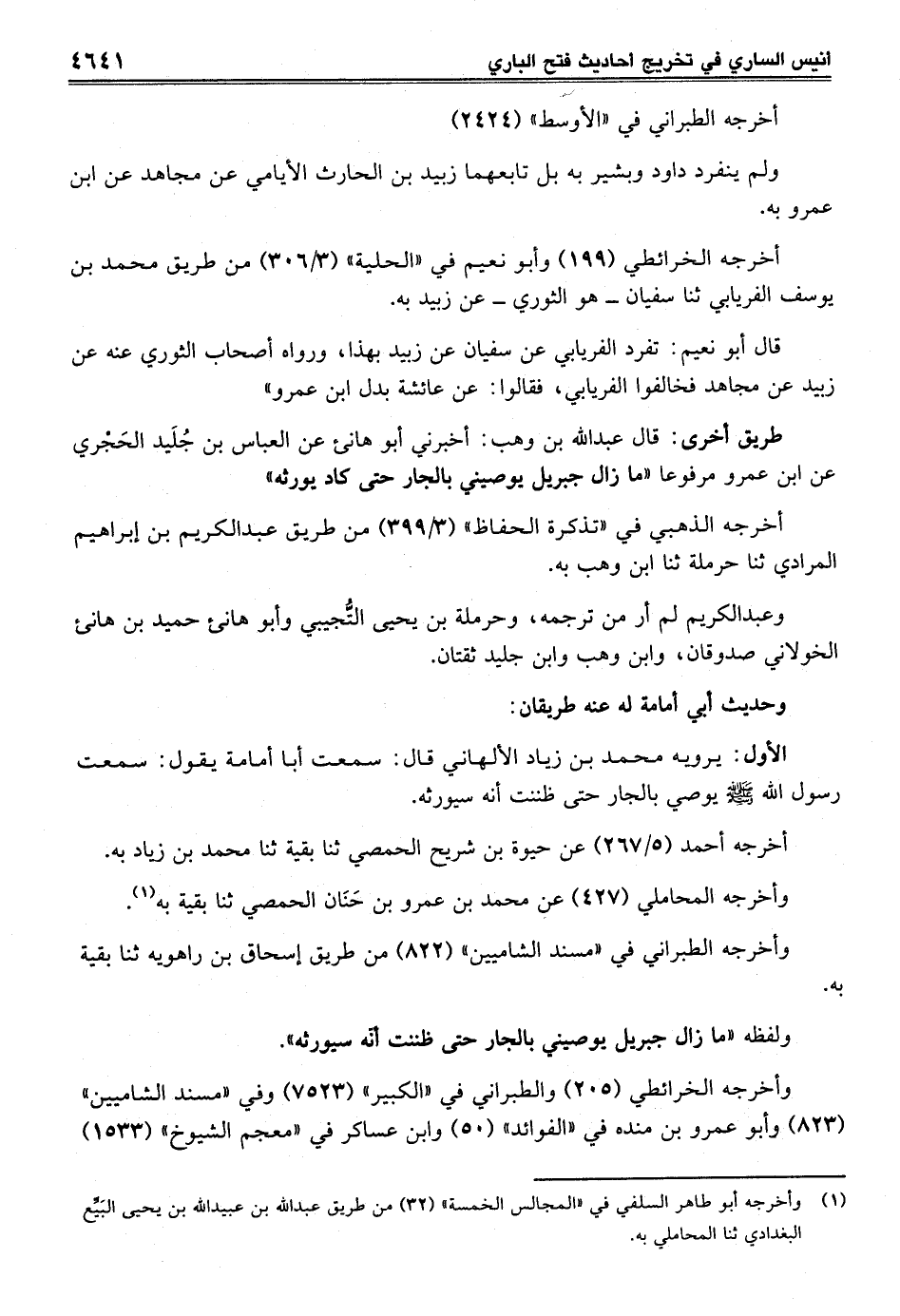 طريق أخرى: قال عبد الله بن وهب: أخبرني أبو هانئ عن العباس بن جُلَيد الحَجْري عن ابن عمرو مرفوعا "ما زال جبريل يوصيني بالجار حتى كاد يورثه"