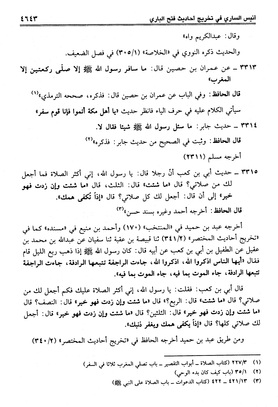 3313 - عن عمران بن حصين قال: ما سافر رسول الله - صلى الله عليه وسلم - إلا صلّى ركعتين إلا المغرب"