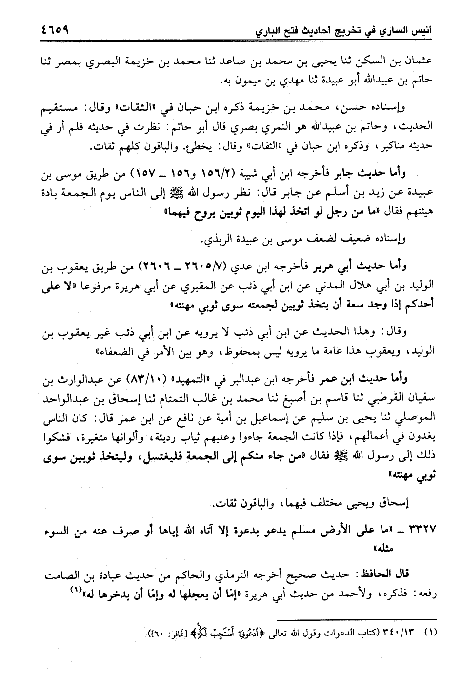 وأما حديث جابر فأخرجه ابن أبي شيبة (2/ 156 و156 - 157) من طريق موسى بن عبيدة عن زيد بن أسلم عن جابر قال: نظر رسول الله - صلى الله عليه وسلم - إلى الناس يوم الجمعة بادة هيئتهم فقال "ما من رجل لو اتخذ لهذا اليوم ثوبين يروح فيهما"