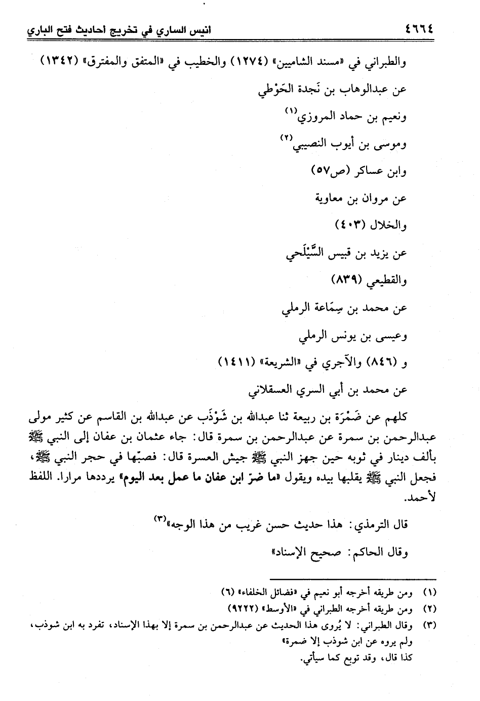 كلهم عن ضَمْرَة بن ربيعة ثنا عبد الله بن شَوْذَب عن عبد الله بن القاسم عن كثير مولى عبد الرحمن بن سمرة عن عبد الرحمن بن سمرة قال: جاء عثمان بن عفان إلى النبي - صلى الله عليه وسلم - بألف دينار في ثوبه حين جهز النبي - صلى الله عليه وسلم - جيش العسرة قال: فصبّها في حجر النبي - صلى الله عليه وسلم -، فجعل النبي - صلى الله عليه وسلم - يقلبها بيده ويقول "ما ضرّ ابن عفان ما عمل بعد اليوم" يرددها مرارا. اللفظ لأحمد.