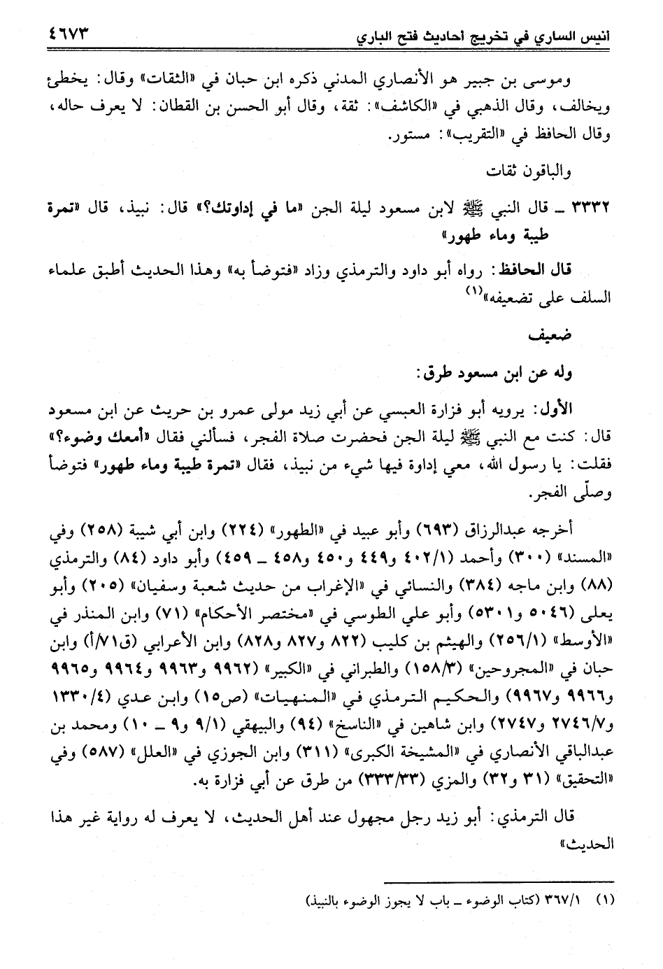 3332 - قال النبي - صلى الله عليه وسلم - لابن مسعود ليلة الجن "ما في إداوتك؟ " قال: نبيذ، قال "تمرة طيبة وماء طهور"