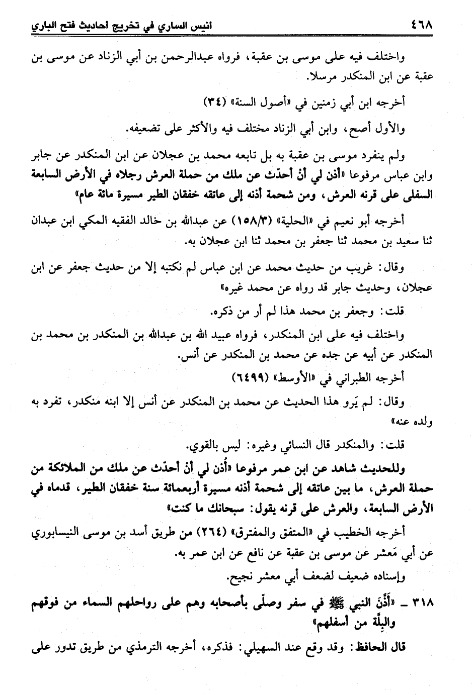 ولم ينفرد موسى بن عقبة به بل تابعه محمَّد بن عجلان عن ابن المنكدر عن جابر وابن عباس مرفوعا "أذن لي أنْ أحدّث عن ملك من حملة العرش رجلاه في الأرض السابعة السفلى على قرنه العرش، ومن شحمة أذنه إلى عاتقه خفقان الطير مسيرة مائة عام"