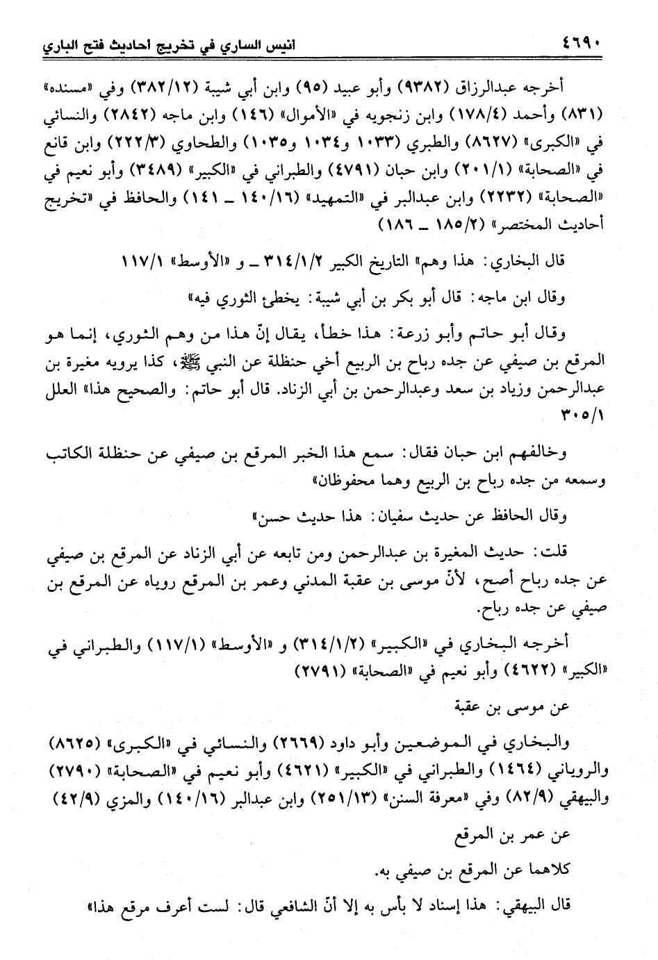 وقال أبو حاتم وأبو زرعة: هذا خطأ، يقال إنّ هذا من وهم الثوري، إنما هو المرقع بن صيفي عن جده رباح بن الربيع أخي حنظلة عن النبي - صلى الله عليه وسلم -، كذا يرويه مغيرة بن عبد الرحمن وزياد بن سعد وعبد الرحمن بن أبي الزناد. قال أبو حاتم: والصحيح هذا" العلل 1/ 305