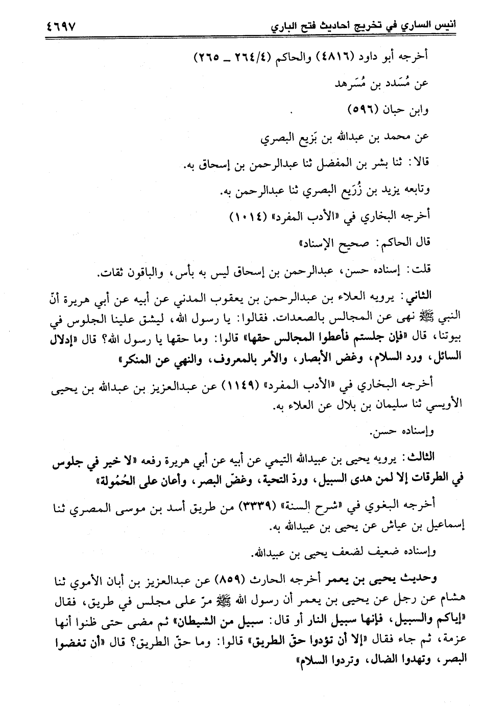 وحديث يحيى بن يعمر أخرجه الحارث (859) عن عبد العزيز بن أبان الأموي ثنا هشام عن رجل عن يحيى بن يعمر أن رسول الله - صلى الله عليه وسلم - مرّ على مجلس في طريق، فقال "إياكم والسبيل، فإنها سبيل النار أو قال: سبيل من الشيطان" ثم مضى حتى ظنوا أنها عزمة، ثم جاء فقال "إلا أن تؤدوا حق الطريق" قالوا: وما حقّ الطريق؟ قال "أن تغضوا البصر، وتهدوا الضال، وتردوا السلام"