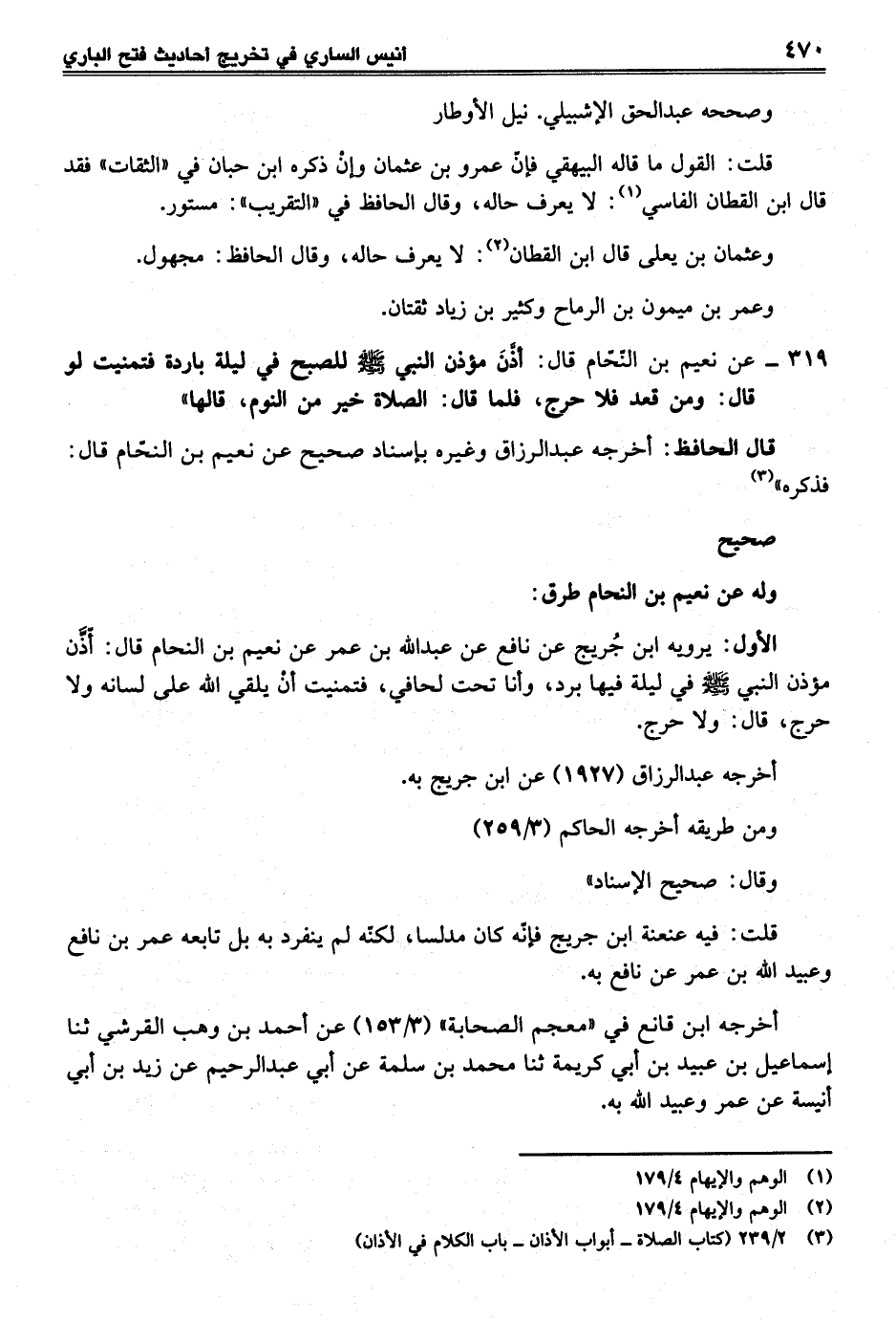 319 - عن نعيم بن النّحّام قال: أذَّنَ مؤذن النبي - صلى الله عليه وسلم - للصبح في ليلة باردة فتمنيت لو قال: ومن قعد فلا حرج، فلما قال: الصلاة خير من النوم، قالها"