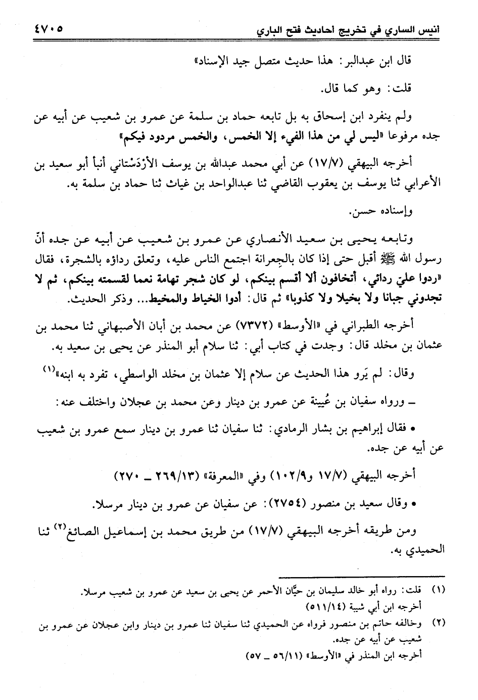 ولم ينفرد ابن إسحاق به بل تابعه حماد بن سلمة عن عمرو بن شعيب عن أبيه عن جده مرفوعا "ليس لي من هذا الفيء إلا الخمس، والخمس مردود فيكم"