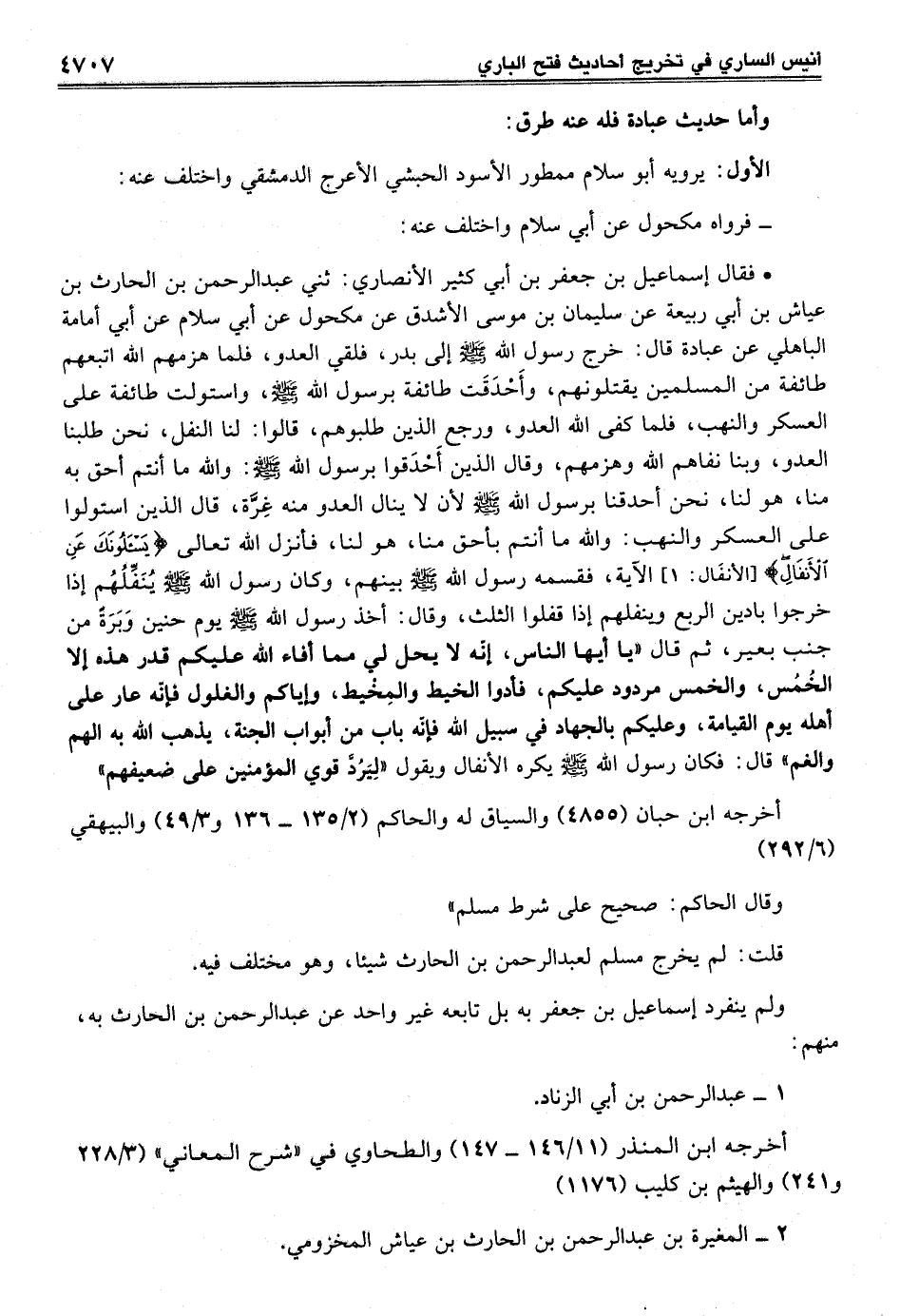 • فقال إسماعيل بن جعفر بن أبي كثير الأنصاري: ثني عبد الرحمن بن الحارث بن عياش بن أبي ربيعة عن سليمان بن موسى الأشدق عن مكحول عن أبي سلام عن أبي أمامة الباهلي عن عبادة قال: خرج رسول الله - صلى الله عليه وسلم - إلى بدر، فلقي العدو، فلما هزمهم الله اتبعهم طائفة من المسلمين يقتلونهم، وأَحْدَقَت طائفة برسول الله - صلى الله عليه وسلم -، واستولت طائفة على العسكر والنهب، فلما كفى الله العدو، ورجع الذين طلبوهم، قالوا: لنا النفل، نحن طلبنا العدو، وبنا نفاهم الله وهزمهم، وقال الذين أَحْدَقوا برسول الله - صلى الله عليه وسلم -: والله ما أنتم أحق به منا، هو لنا، نحن أحدقنا برسول الله - صلى الله عليه وسلم - لأن لا ينال العدو منه غِرَّة، قال الذين استولوا على العسكر والنهب: والله ما أنتم بأحق منا، هو لنا، فأنزل الله تعالى {يَسْأَلُونَكَ عَنِ الْأَنْفَالِ} [الأنفَال: 1] الآية، فقسمه رسول الله - صلى الله عليه وسلم - بينهم، وكان رسول الله - صلى الله عليه وسلم - يُنَفِّلُهُم إذا خرجوا بادين الربع وينفلهم إذا قفلوا الثلث، وقال: أخذ رسول الله - صلى الله عليه وسلم - يوم حنين وَبَرَةّ من جنب بعير، ثم قال "يا أيها الناس، إنّه لا يحل لي مما أفاء الله عليكم قدر هذه إلا الخُمُس، والخمس مردود عليكم، فأدوا الخيط والمِخْيط، وإياكم والغلول فإنّه عار على أهله يوم القيامة، وعليكم بالجهاد في سبيل الله فإنّه باب من أبواب الجنة، يذهب الله به الهم والغم" قال: فكان رسول الله - صلى الله عليه وسلم - يكره الأنفال ويقول "لِيَرُدَّ قوي المؤمنين على ضعيفهم"