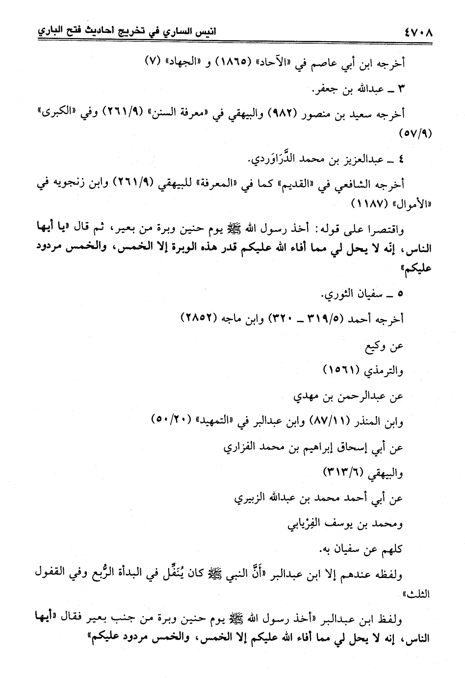 ولفظ ابن عبد البر "أخذ رسول الله - صلى الله عليه وسلم - يوم حنين وبرة من جنب بعير فقال "أيها الناس، إنه لا يحل لي مما أفاء الله عليكم إلا الخمس، والخمس مردود عليكم"