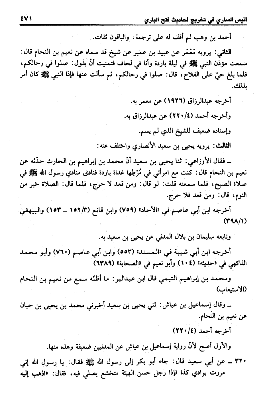- فقال الأوزاعي: ثنا يحيى بن سعيد أنّ محمَّد بن إبراهيم بن الحارث حدّثه عن نعيم بن النحام قال: كنت مع امرأتي في مُرْطِها غداة باردة فنادى منادي رسول الله - صلى الله عليه وسلم - في صلاة الصبح، فلما سمعته قلت: لو قال: ومن قعد لا حرج، فلما قال: الصلاة خير من النوم، قال: ومن قعد فلا حرج.