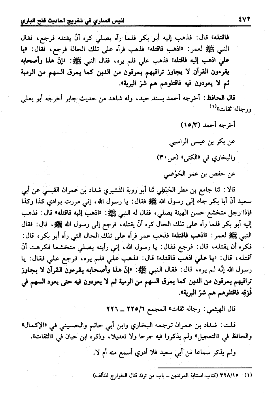 قالا: ثنا جامع بن مطر الحَبَطِي ثنا أبو روبة القشيري شداد بن عمران القيسي عن أبي سعيد أنّ أبا بكر جاء إلى رسول الله - صلى الله عليه وسلم - فقال: يا رسول الله، إني مررت بوادي كذا وكذا فإذا رجل متخشع حسن الهيئة يصلي، فقال له النبي - صلى الله عليه وسلم -: "اذهب إليه فاقتله" قال: فذهب إليه أبو بكر فلما رآه على تلك الحال كره أن يقتله، فرجع إلى رسول الله - صلى الله عليه وسلم -، قال: فقال النبي - صلى الله عليه وسلم - لعمر: "اذهب فاقتله" فذهب عمر فرآه على تلك الحال التي رآه أبو بكر، قال: فكره أن يقتله، قال: فرجع فقال: يا رسول الله، إني رأيته يصلي متخشعا فكرهت أنْ أقتله، قال: "يا علي اذهب فاقتله" قال: فذهب علي فلم يره، فرجع علي فقال: يا رسول الله إنّه لم يره، قال: فقال النبي - صلى الله عليه وسلم -: "إنّ هذا وأصحابه يقرءون القرآن يجاوز تراقيهم يمرقون من الدين كما يمرق السهم من الرمية ثم لا يعودون فيه حتى يعود السهم في فُوْقِه فاقتلوهم هم شرّ البرية".