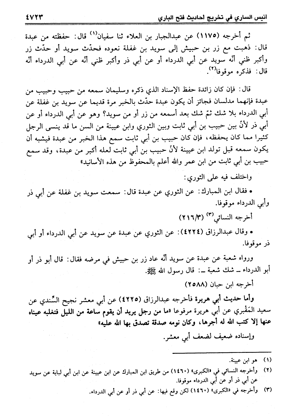 ثم أخرجه (1175) عن عبد الجبار بن العلاء ثنا سفيان (¬1) قال: حفظته من عبدة قال: ذهيت مع زر بن حبيش إلى سويد بن غفلة نعوده فحدّث سويد أو حدّث زر وأكبر ظني أنّه سويد عن أبي الدرداء أو عن أبي ذر وأكبر ظني أنّه عن أبي الدرداء أنّه قال: فذكره موقوفا (¬2).