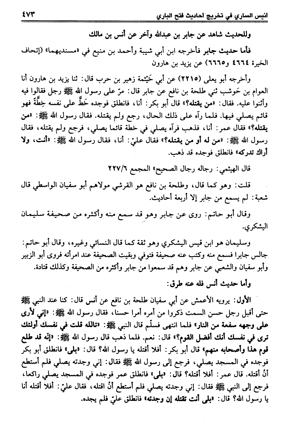 وأخرجه أبو يعلى (2215) عن أبي خَيْثمة زهير بن حرب قال: ثنا يزيد بن هارون أنا العوام بن حَوشب ثني طلحة بن نافع عن جابر قال: مرّ على رسول الله - صلى الله عليه وسلم - رجل فقالوا فيه وأثنوا عليه. فقال: "من يقتله؟ " قال أبو بكر: أنا، فانطلق فوجده خَطَّ على نفسه خِطَّةً فهو قائم يصلي فيها. فلما رآه على ذلك الحال، رجع ولم يقتله. فقال رسول الله - صلى الله عليه وسلم -: "من يقتله؟ " فقال عمر: أنا، فذهب فرآه يصلي في خطة قائما يصلي، فرجع ولم يقتله، فقال رسول الله - صلى الله عليه وسلم -: "من له أو من يقتله؟ " فقال عليّ: أنا، فقال رسول الله - صلى الله عليه وسلم -: "أنت، ولا أراك تدركه" فانطلق فوجده قد ذهب.