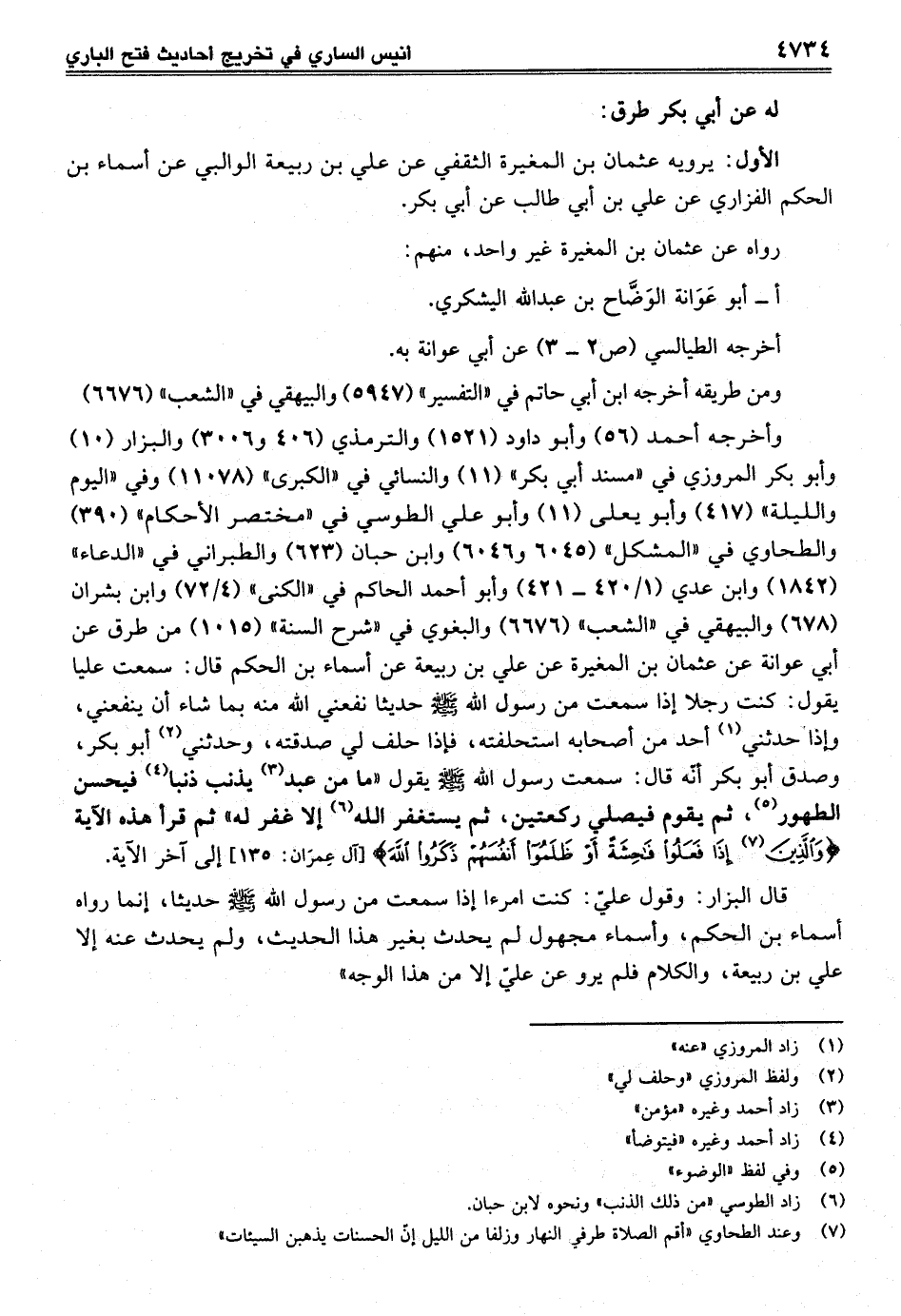 ومن طريقه أخرجه ابن أبي حاتم في "التفسير" (5947) والبيهقي في "الشعب" (6676) وأخرجه أحمد (56) وأبو داود (1521) والترمذي (406 و 3006) والبزار (10) وأبو بكر المروزي في "مسند أبي بكر" (11) والنسائي في "الكبرى" (11078) وفي "اليوم والليلة" (417) وأبو يعلى (11) وأبو علي الطوسي في "مختصر الأحكام" (390) والطحاوي في "المشكل" (6045 و 6046) وابن حبان (623) والطبراني في "الدعاء" (1842) وابن عدي (1/ 420 - 421) وأبو أحمد الحاكم في "الكنى" (4/ 72) وابن بشران (678) والبيهقي في "الشعب" (6676) والبغوي في "شرح السنة" (1015) من طرق عن أبي عوانة عن عثمان بن المغيرة عن علي بن ربيعة عن أسماء بن الحكم قال: سمعت عليا يقول: كنت رجلا إذا سمعت من رسول الله - صلى الله عليه وسلم - حديثا نفعني الله منه بما شاء أن ينفعني، وإذا حدثني (¬1) أحد من أصحابه استحلفته، فإذا حلف لي صدقته، وحدثني (¬2) أبو بكر، وصدق أبو بكر أنّه قال: سمعت رسول الله - صلى الله عليه وسلم - يقول "ما من عبد (¬3) يذنب ذنبا (¬4) فيحسن الطهور (¬5)، ثم يقوم فيصلي ركعتين، ثم يستغفر الله (¬6) إلا غفر له" ثم قرأ هذه الآية {وَالَّذِينَ (¬7) إِذَا فَعَلُوا فَاحِشَةً أَوْ ظَلَمُوا أَنْفُسَهُمْ ذَكَرُوا اللَّهَ} [آل عِمرَان: 135] إلى آخر الآية.