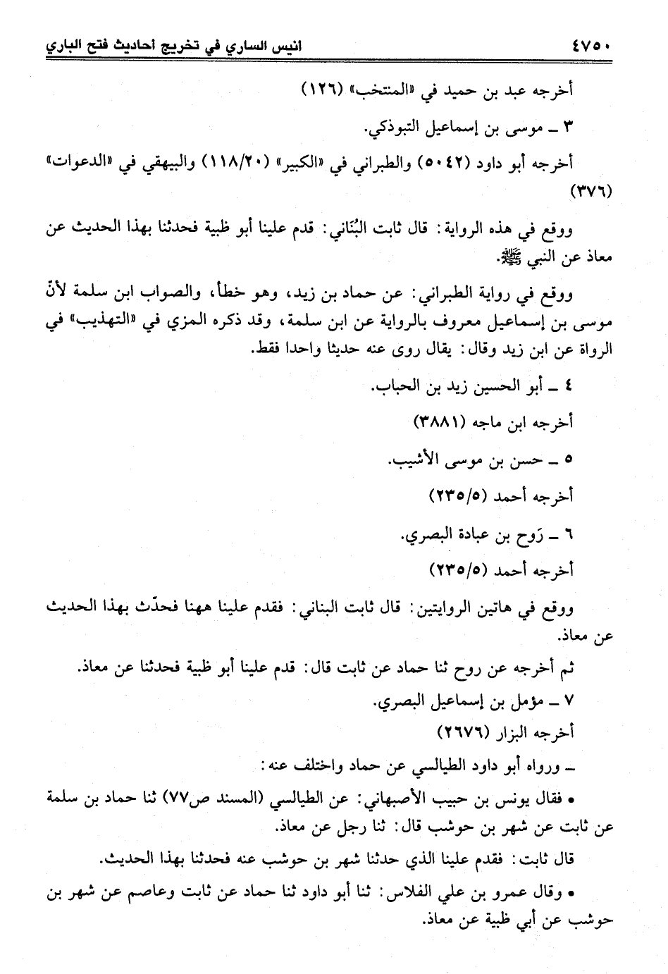 • وقال عمرو بن علي الفلاس: ثنا أبو داود ثنا حماد عن ثابت وعاصم عن شهر بن حوشب عن أبي ظبية عن معاذ.