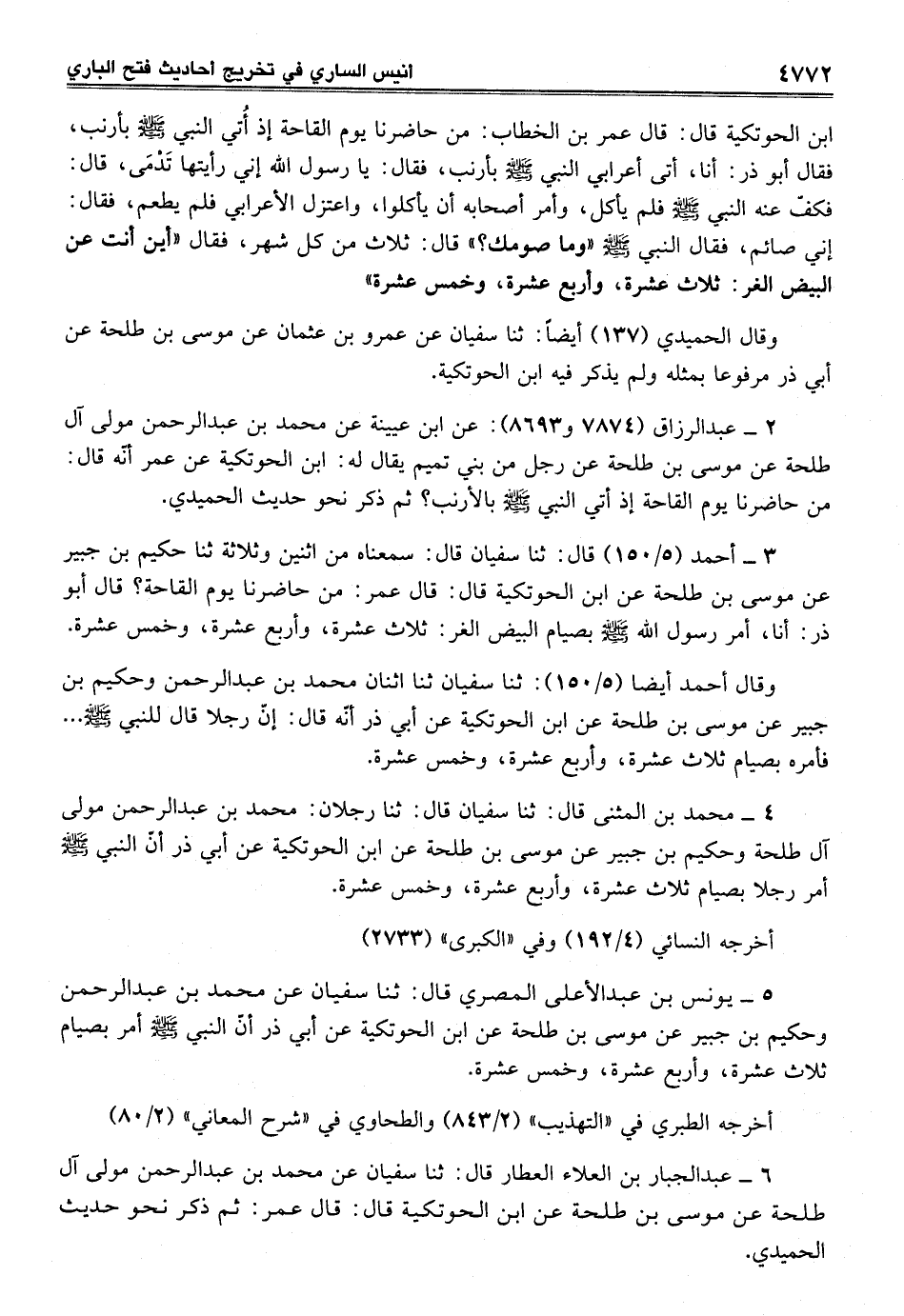 4 - محمد بن المثنى قال: ثنا سفيان قال: ثنا رجلان: محمد بن عبد الرحمن مولى آل طلحة وحكيم بن جبير عن موسى بن طلحة عن ابن الحوتكية عن أبي ذر أنّ النبي - صلى الله عليه وسلم - أمر رجلا بصيام ثلاث عشرة، وأربع عشرة، وخمس عشرة.